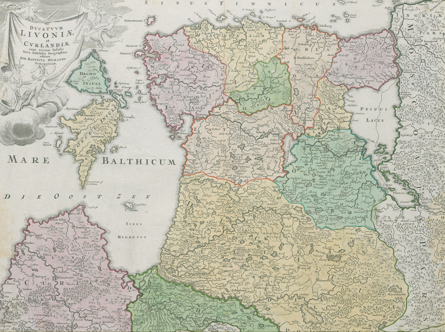 Homann, Johann Baptist. Ducatuum Livoniae et Curlandiae cum vicinis insulis. Grenz- und flächenkolorierte Kupferstichkarte, von 2 Platten gedruckt und zusammenmontiert. 54 x 59 cm. Mit Titelkartusche und Meilenanzeiger. Nürnberg um 1712.