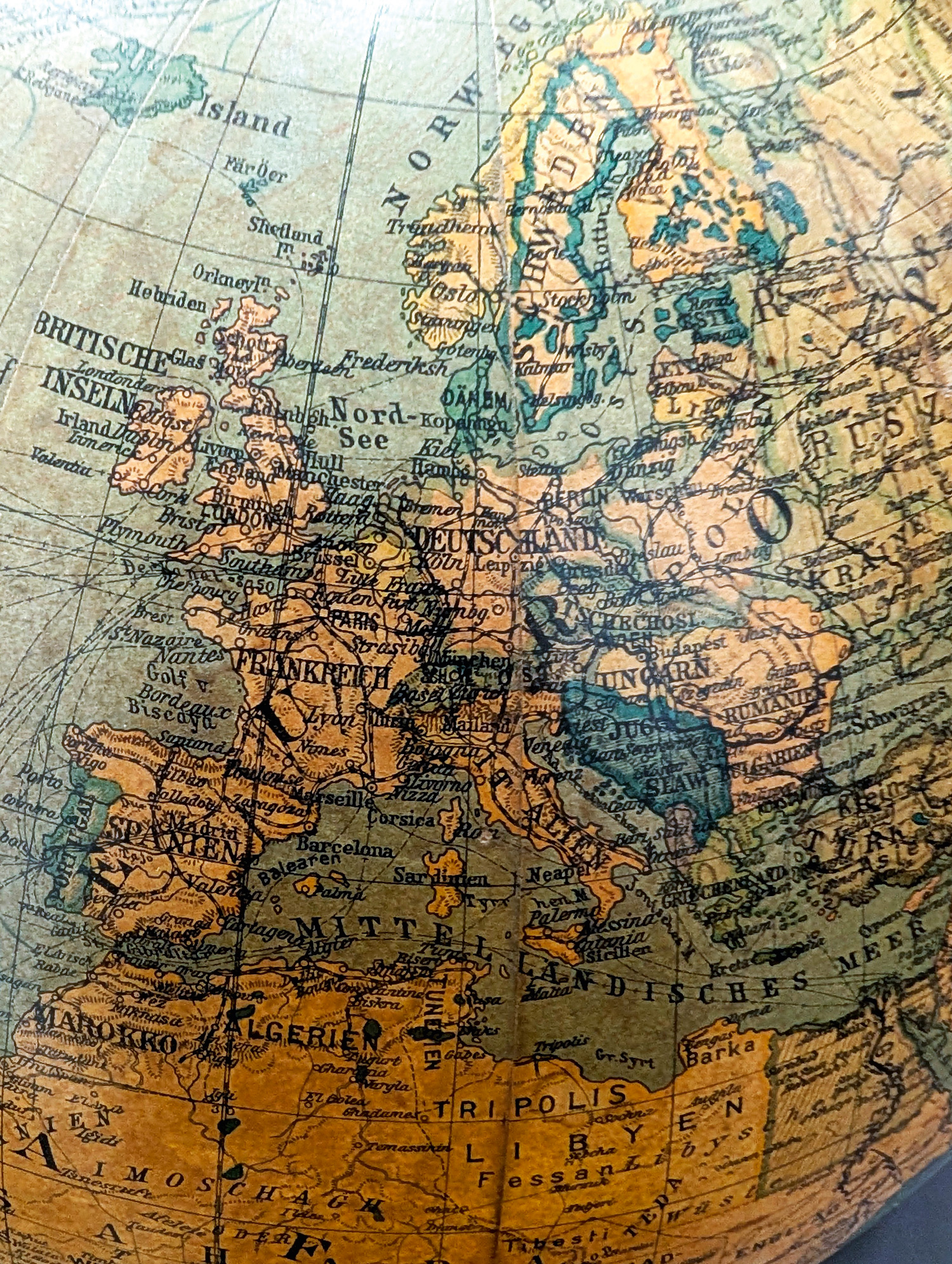 Dekorativer Globus mit klarer kartographischer Darstellung für didaktische Zwecke. – An den Ansatzstücken der Falzen Abnutzungsspuren. Mit altersbedingter Patina.