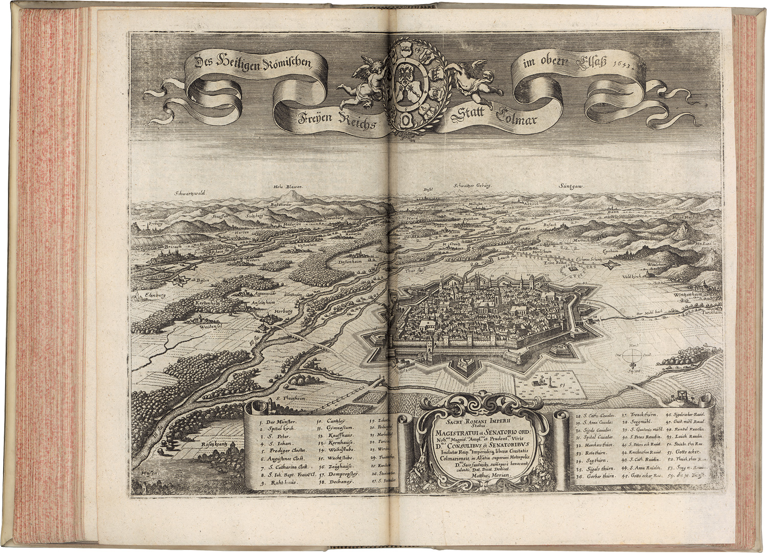Wüthrich 11. – Erste Ausgabe. Eine der frühesten deutschen Topographien von Merian, noch vor dem Ende des Dreißigjährigen Krieges entstanden. Vorhanden sind : I. Topographia Sveviae, das ist Beschreib- und aigentliche Abcontrafeitung der fürnembsten Stätt und Plätz in Ober und Nider Schwaben, Herzogthum Würtenberg, Marggraffschafft Baden. - II. Topographia Alsatiae, completa . Das ist vollkömmliche Beschreibung und Eigentliche Abbildung der vornehmsten Städte und Oerter im Obern- und Unter-Elsaß ... - II. Topographia Palatinaturs Rheni et vicinarum regionum. Das ist Beschreibung und eigentliche Abbildung der vornemsten statte und Plätze Intern Pfalz am Rhein und benachbarten Landschaften ... – Vorderes Innengelenk teils offen, vereinzelt leicht fleckig, sonst gutes Exemplar.