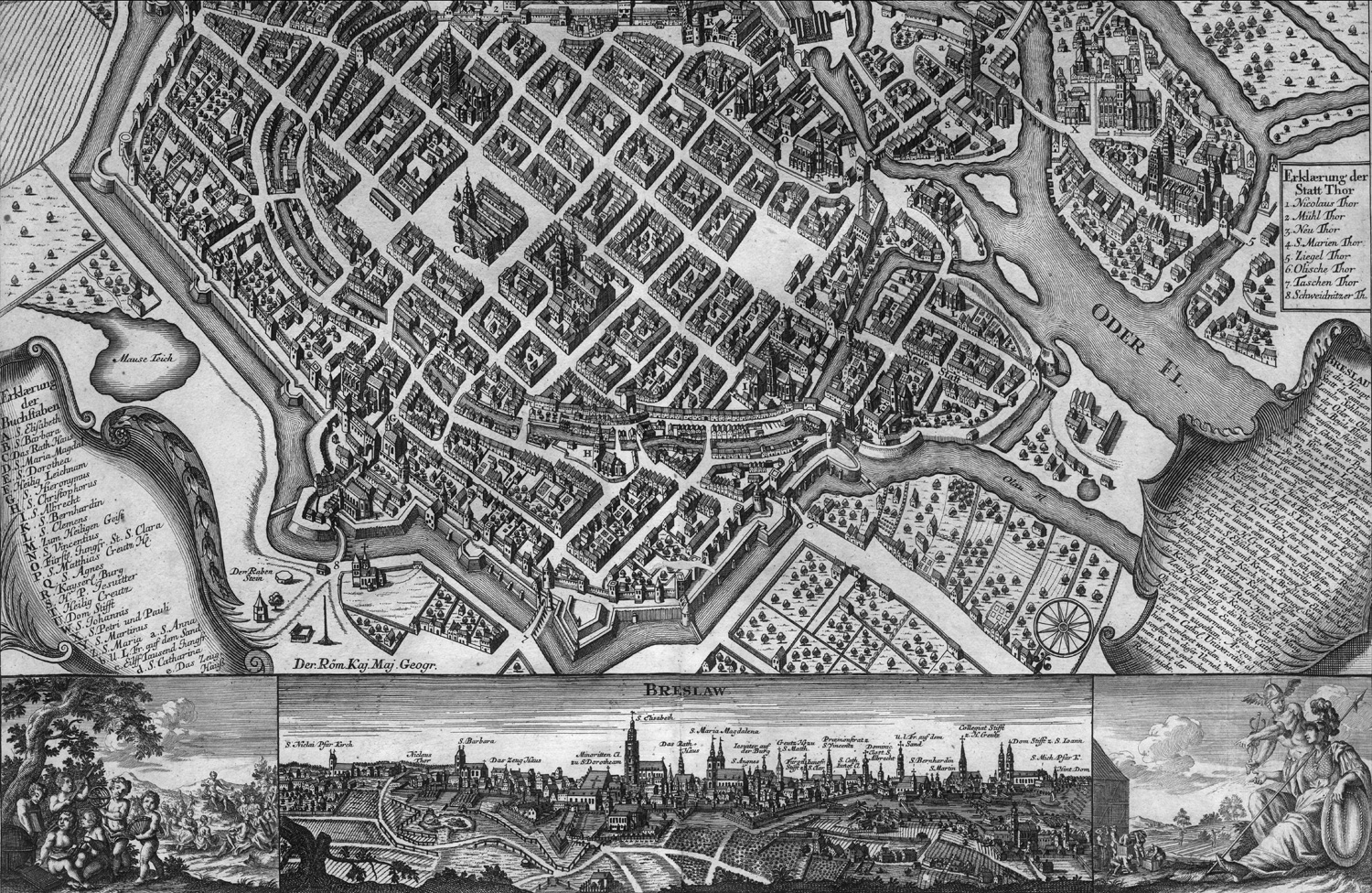 Seutter, Matthäus. Wratislavia Antiquissima et Celeberrima Ducat. Silesiaci Metropolis...Breslau due. Kupferstich, von 2 Platten gedruckt und zusammenmontiert. Mit 2 Wappen, Windrose, Legende und erläuterndem Text, unten eine Panoramaansicht der Stadt mit Bezeichnungen, flankiert von figürlichen Szenen. Mit Passepartout unter Glas in Holzprofilleiste. Augsburg, M. Seutter, ca. 1735.
