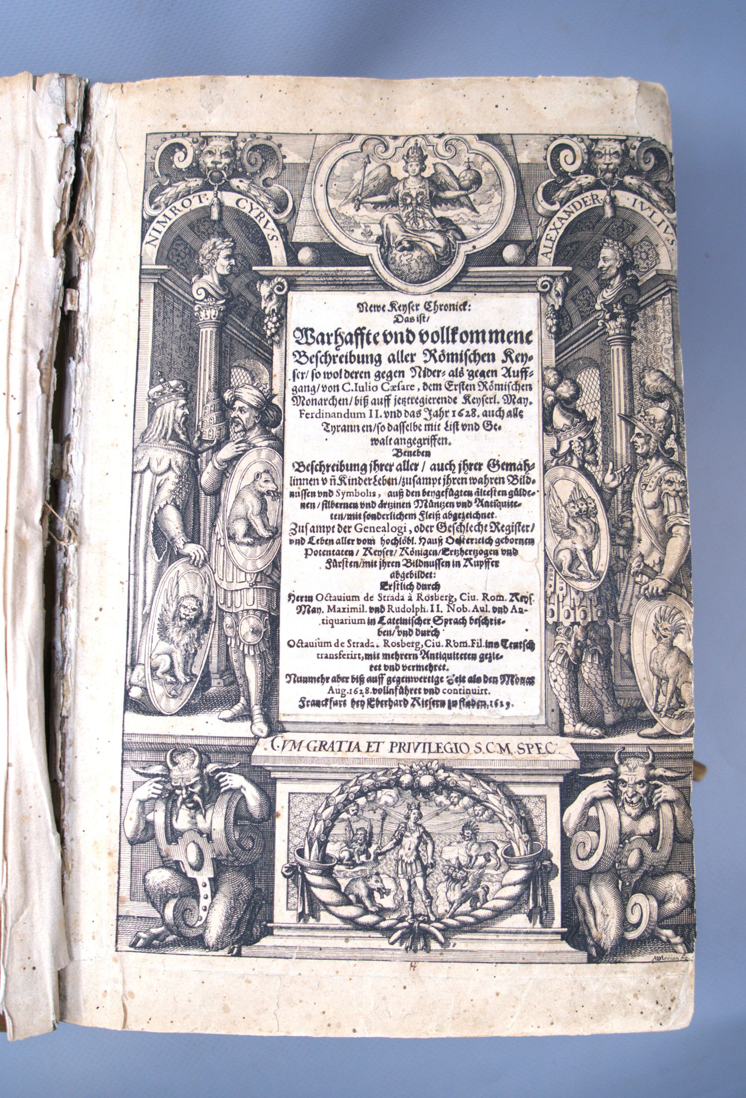 Strada à Rosenberg, Octavius de. Newe Keyser Chronick: Das ist, Wahrhaffte und vollkommene Beschreibung aller Römischen Keyser. Beneben Beschreibung ihrer aller, auch ihrer Gemahlinnen und Kinder Leben. Nunmehr aber biß auff gegenwertige Zeit also den Monat Aug. 1628 vollnführet und continuirt. 4 (statt 5) Bl. 596 S., 6 Bl. (l. w.). Mit szenischer gestochener Titelbordüre, Wappenkupfer und rund 570 Münzkupfern im Text. 29,5 x 19 cm. Pergament d. Z. (stärker fleckig und berieben, vorderes Gelenk geplatzt, mit hs. RTitel, Schließbänder teils lädiert). Frankfurt, Eberhard Kieser, 1629.