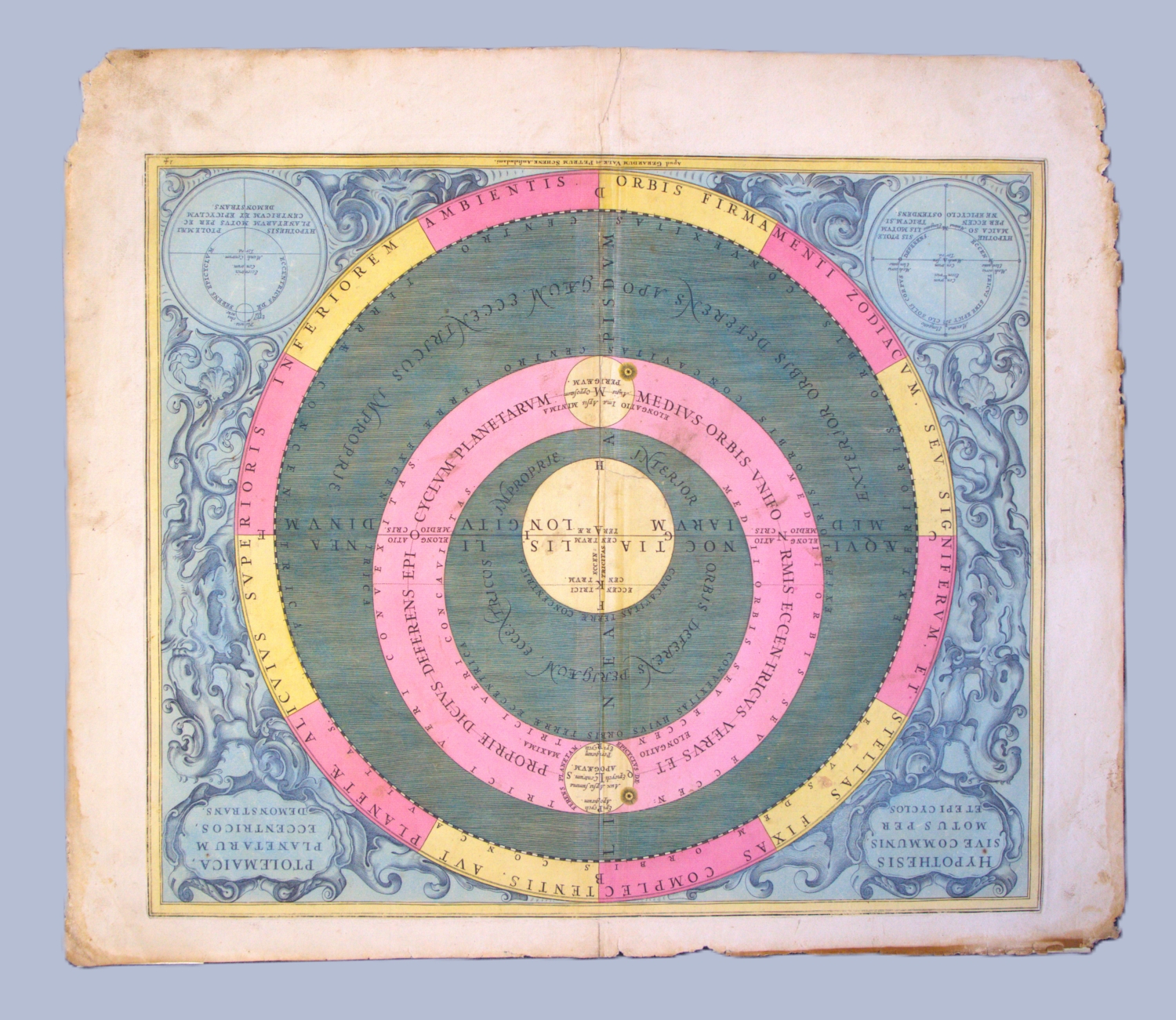 Aus dem Atlas Coelestis seu Harmonia Macrocosmica, dem ersten in den Niederlanden erschienenen Himmelsatlas. Andreas Cellarius (1596-1665) vereinte hierin die kosmologischen Systeme von Ptolemäus, Kopernikus und Tycho Brahe. – Starke Randschäden und -Läsuren, teils mit Einrissen und Wasserflecken. Die Darstellungen selbst überwiegend gut erhalten und im schönem, kräftigem Kolorit.