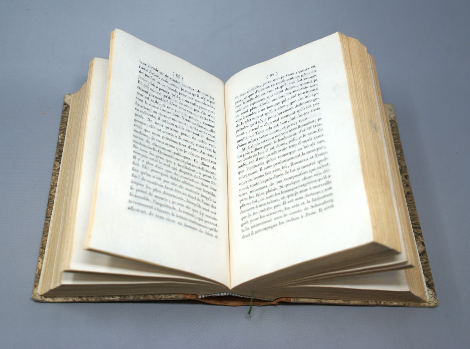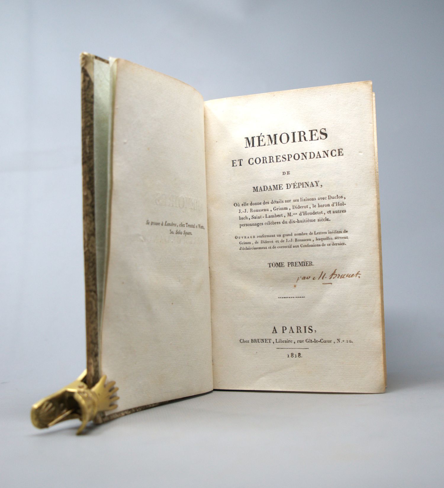 Epinay, (L. F. P. Tardieu d'Esclavelles d'). Mémoires et correspondance, où elle donne des détails sur ses liaisons avec Duclos, J.-J. Rousseau, Grimm, Diderot, le Baron d'Holbach, Saint-Lambert. Ouvrage renfermant un grand nombre de lettres inédites de Grimm, de Diderot et de J.-J. Rousseau. 3 Teile in 1 Band. 20 x 13 cm. Halbleder d. Z. mit RVergoldung und 2 goldgeprägten RSchildern. Paris, Brunet, 1818.