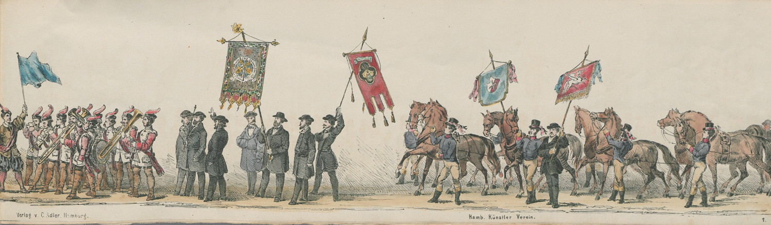 Dargestellt ist der hamburger Festzug zur Gedächnisfeier des hundertjährigen Geburtstages von Friedrich Schiller. Dieser setzt sich zusammen aus "Anführer nebst Adjudanten", "Comité nebst Ehrengästen", "Oberst Nicol", "Officiercorps", "Acad: Gymnasium", "Prima", "Secunda", "Tertia", "Real Gymnasium", "Schulwissenschaftlicher-Bildungsverein", "Dramatische Künstler", "Germania", "Montagsschuh", "Sängerbund", "Eintracht", etc. – Papierbedingt gebräunt, leicht feuchtfleckig, Blätter teils lose.