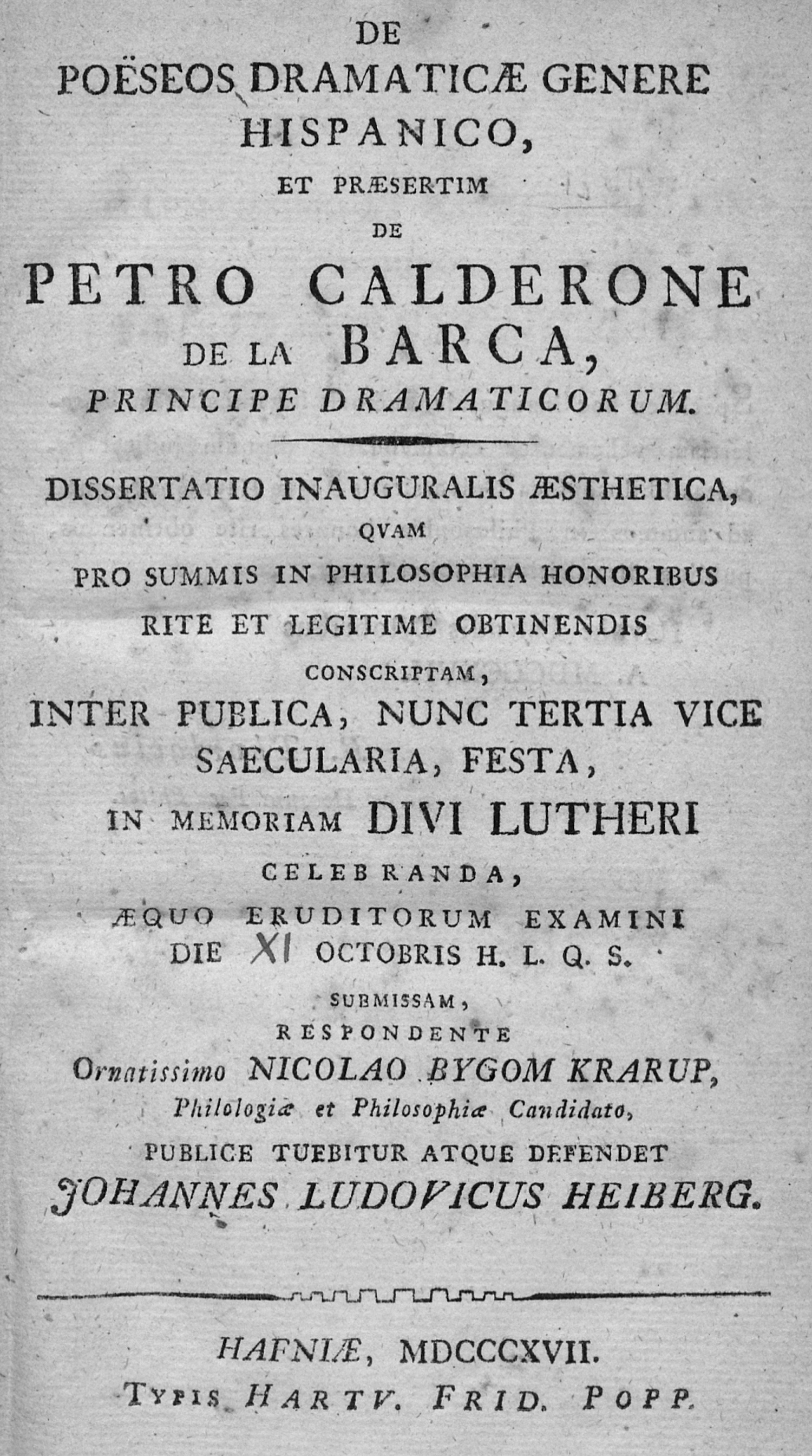 Heiberg, Johan Ludvig. De poësos dramaticae genere Hispanico, et prasertim de Petro Calderone de la Barca, principe dramaticorum. Dissertatio inauguralis aesthetica, quam pro summis in philosophia honoribus conscriptam. 5 Bl., 158 S. 16, 5 x 10 cm. Schlichter moderner Pappband. Kopenhagen, Popp, 1817.