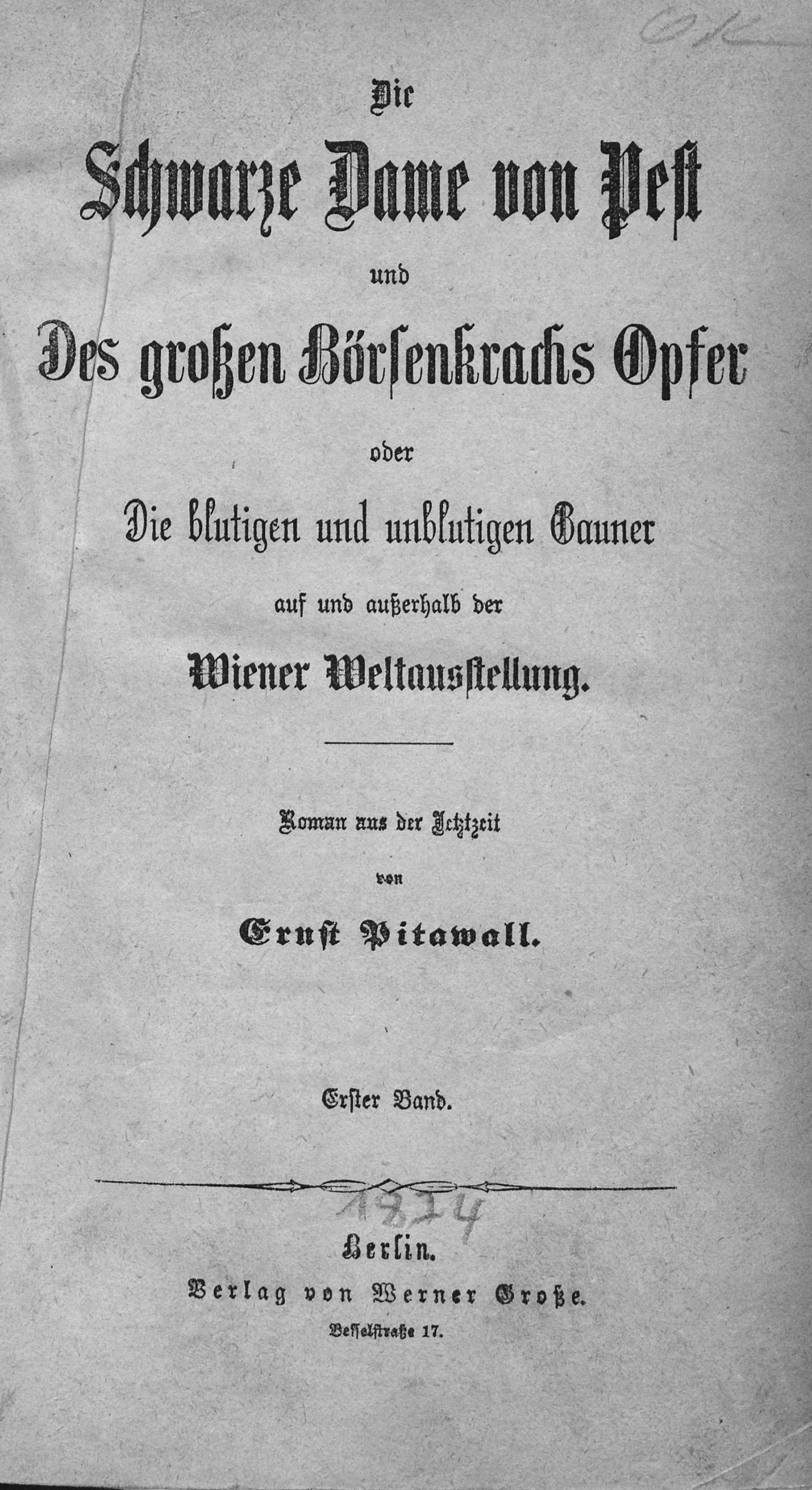 Kolportage. - Pitawall, Ernst (d. i. E. H. v. Dedenroth). Die schwarze Dame von Pest und des großen Börsenkrachs Opfer oder Die blutigen und unblutigen Gauner auf und außerhalb der Wiener Weltausstellung. Roman aus der Jetztzeit. 1439 S. (statt 1440). 20,5 x 12,5 cm. Halbleinen d. Z. (fleckig und berieben) mit hs. RSchild. Berlin, Werner Große, (1874).