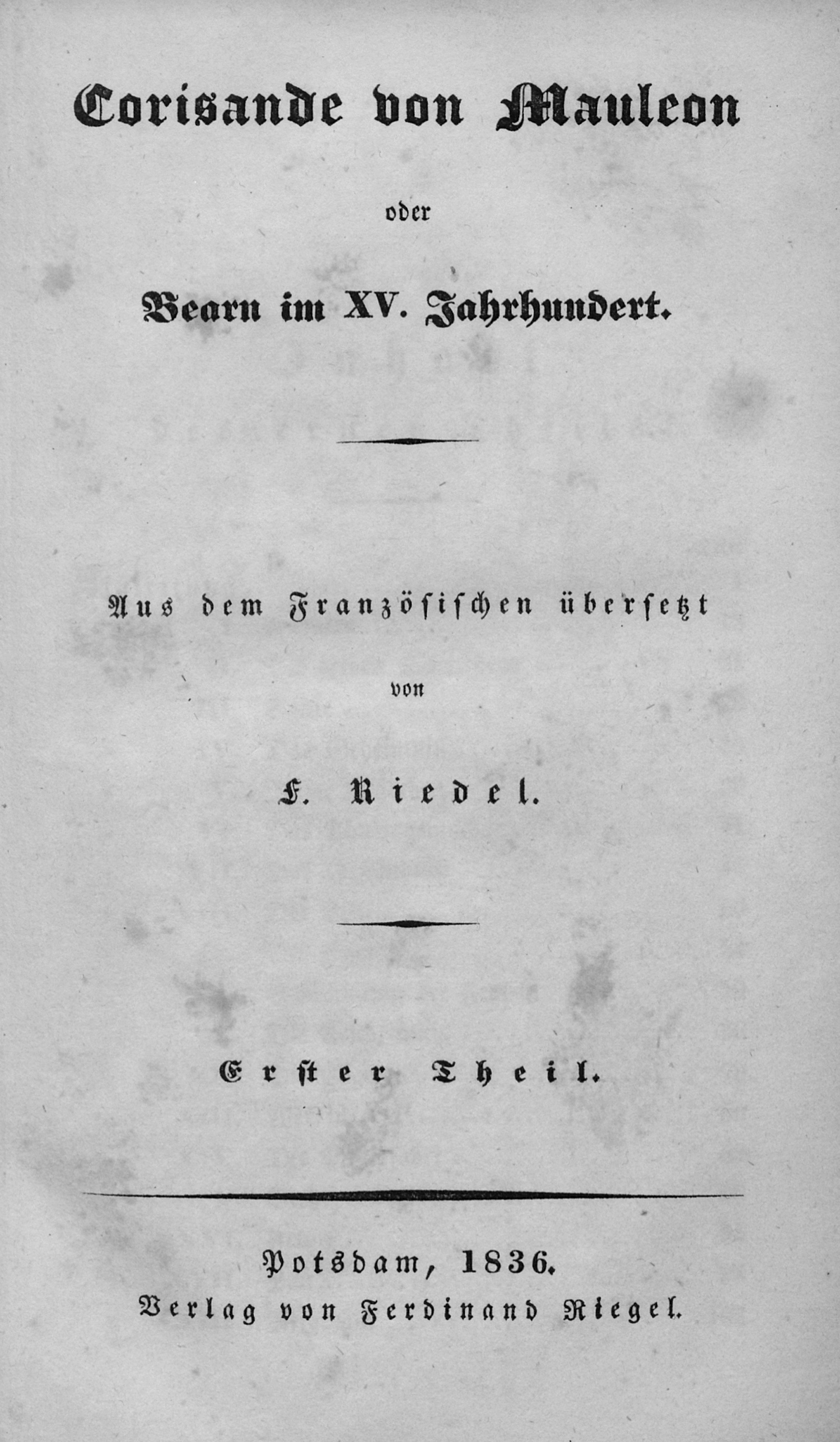 (Montpezat de Redern, Henriette). Corisande von Mauleon oder Bearn im XV Jahrhundert. Aus dem Französischen übersetzt von F. Riedel. 2 Teile in 1 Band. S. III-VI, 221 S.; VI, 238 S. 17,5 x 10,5 cm. Blindgeprägter Halbleinenband d. Z. (Ecken etwas bestoßen, Rücken ausgeblichen) mit RVergoldung und goldgeprägtem RTitel. Potsdam, Ferdinand Riegel, 1836.