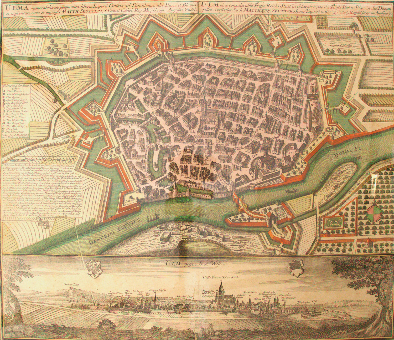 Seutter, Matthäus. Ulma memorabilis ac permunita libera imperii civitas ad danubium. Kolorierter Kupferstich, von zwei Platten gedruckt und zusammenmontiert. 50 x 57 cm (Darstellung). Mit Passepartout unter Glas in goldlackiertem-ornamentalen Holzrahmen (dieser mit kleinen Ausbrüchen). Augsburg um 1740.