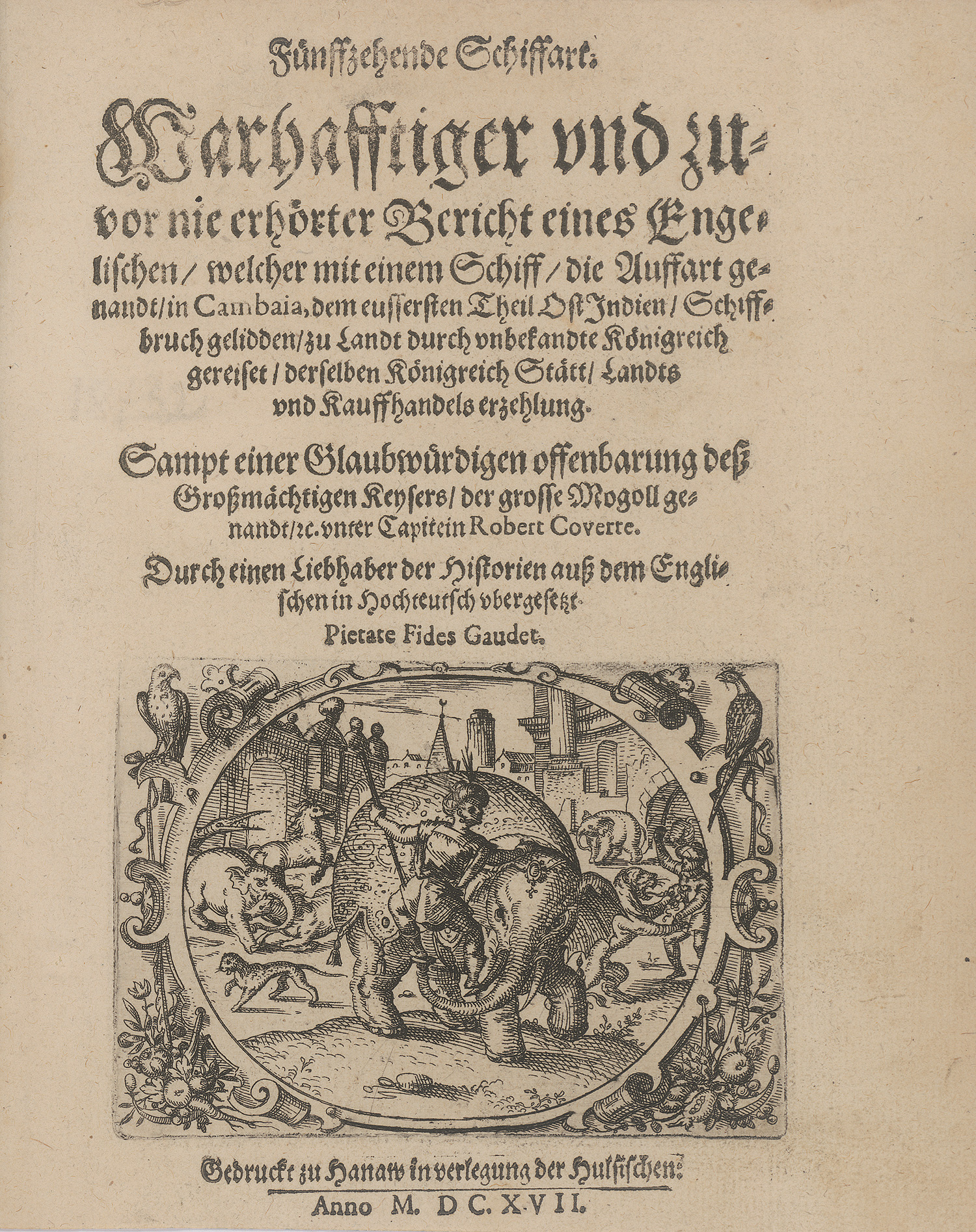III. Robert Coverte. Fünffzehende Schiffart: warhafftiger und zuvor nie erhörter Bericht eines Engelischen, welcher mit einem Schiff, die Auffart genandt, in Cambia, dem eussersten Theil Ost-Indien, Schiffbruch gelidden, zu Landt durch unbekannte Königreich gereiset, derselben Königreich Stätt, Landts u. Kauffhandels Erzehlung. Hanau, Hulsius, 1617. - VD17 23:299776K.