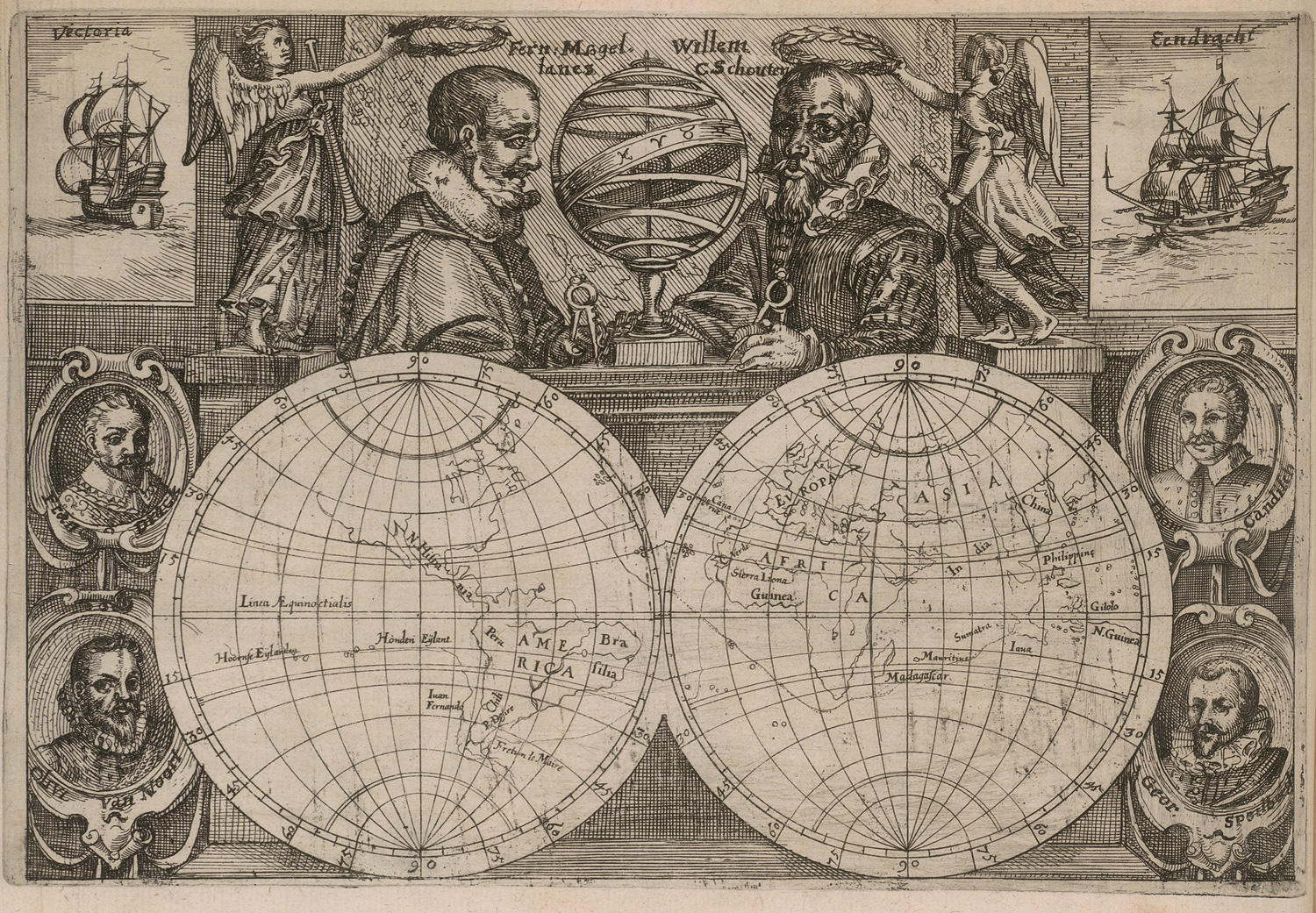 IV. Willem Corneliszoon Schouten. Die sechtzehende Schifffahrt, Journal, Oder Beschreibung der wunderbaren Reise Wilhelm Schouten auß Hollandt, im Jahr 1615. Frankfurt, Hulsius, 1619. - VD17 23:237082U.