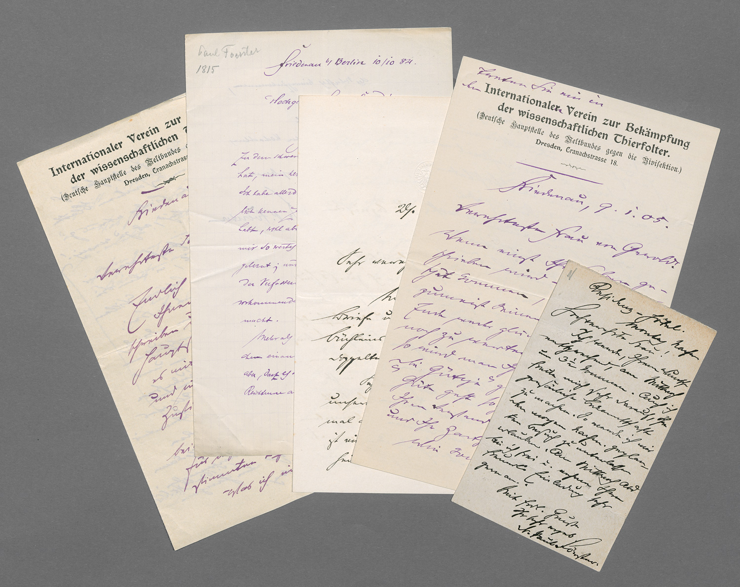 Großenteils umfangreiche Schreiben an die Salonnière Rosa von Gerold (1829-1907) in Wien, teils persönlicher, teils fachlicher Natur. Ein Kondolenzschreiben zum Tod ihres Gatten (des bekannten Verlegers) aus dem Jahr 1884 schließt Förster mit den Worten: "… in der Hoffnung aber, daß es Ihnen gelinge, mit dem eigenen Reichtum an geistiger Kraft über die Schwere des Verlustes hinwegzukommen, verbleibe ich in vorzüglicher Hochachtung - Ihr ganz ergebener ...". Zwei Briefe auf Papier mit gedrucktem Briefkopf des "Internationalen Vereins zur Bekämpfung der wissenschaftlichen Thierfolter (Deutsche Hauptstelle des Weltbundes gegen die Vivisektion)", Dresden, Cranachstraße 18, beziehen sich auf von der Adressatin übersandte Bücher, zu denen Förster Anmerkungen übermittelt. Er bietet an, im Gegenzug eigene Schriften zur Durchsicht zu übersenden - "eine Gegengabe, die ich Ihnen darbieten könnte". In einem weiteren Schreiben (Friedenau, 9. I. 1905) sendet er Neujahrsgrüße, in denen er Zeilen aus Schillers Ode an die Freude ("Freude, schöner Götterfunken") aufgreift und über den Heiligen Geist "Spiritus Sanctus" und den "Spiritus vini" reflektiert, ferner beruft er sich auf eine geistige "Waffenbrüderschaft". – Mit üblichen Faltspuren und vereinzelten Einrissen.