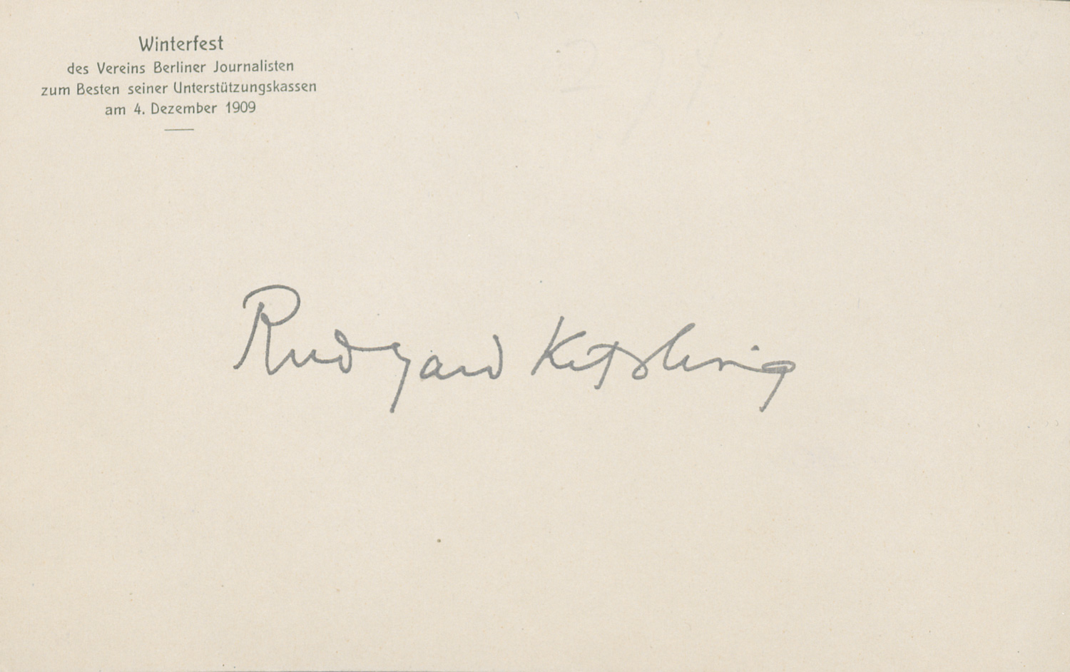 Kipling Rudyard, britischer Schriftsteller und Lyriker, Nobelpreisträger (1865-1936). Eigh. Signatur "Rudyard Kipling". Auf einer bedruckten Karte des Vereins Berliner Journalisten. 10 x 16 cm. (Berlin) 4.XII.1909.