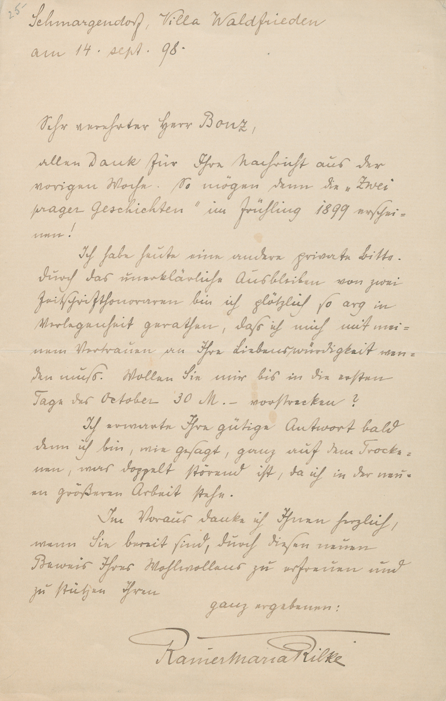 An seinen Verleger Alfred Bonz in Stuttgart, dem er für die Mitteilung dankt, dass seine "Zwei Prager Geschichten" im Frühjahr 1899 erscheinen werden. Zugleich bittet der 23jährige Dichter wegen akuten Geldmangels um Vorschuss. "... Durch das unerklärliche Ausbleiben von zwei Zeitschriftenhonoraren bin ich plötzlich so arg in Verlegenheit gerathen, daß ich mich mit meinem Vertrauen an Ihre Liebenswürdigkeit wenden muß. Wollen Sie mir bis in die ersten Tage des October 30 M.- vorstrecken? Ich erwarte Ihre gütige Antwort bald, denn ich bin, wie gesagt, ganz auf dem Trockenen, was doppelt störend ist, da ich in der neuen größeren Arbeit stehe ...". - "R. bezieht ein Zimmer in der Villa Waldfrieden, Berlin-Schmargendorf, Hundekehlestr. 11 ... R. hilft bei täglichen Hausarbeiten, hackt Holz, macht barfuß weite Wald- und Wiesenwege. R. raucht nicht und meidet Alkohol, hat eine Vorliebe für Tee später auch Kaffee" (Schnack, Rilke-Chronik, wo dieser frühe Brief nicht erwähnt wird).