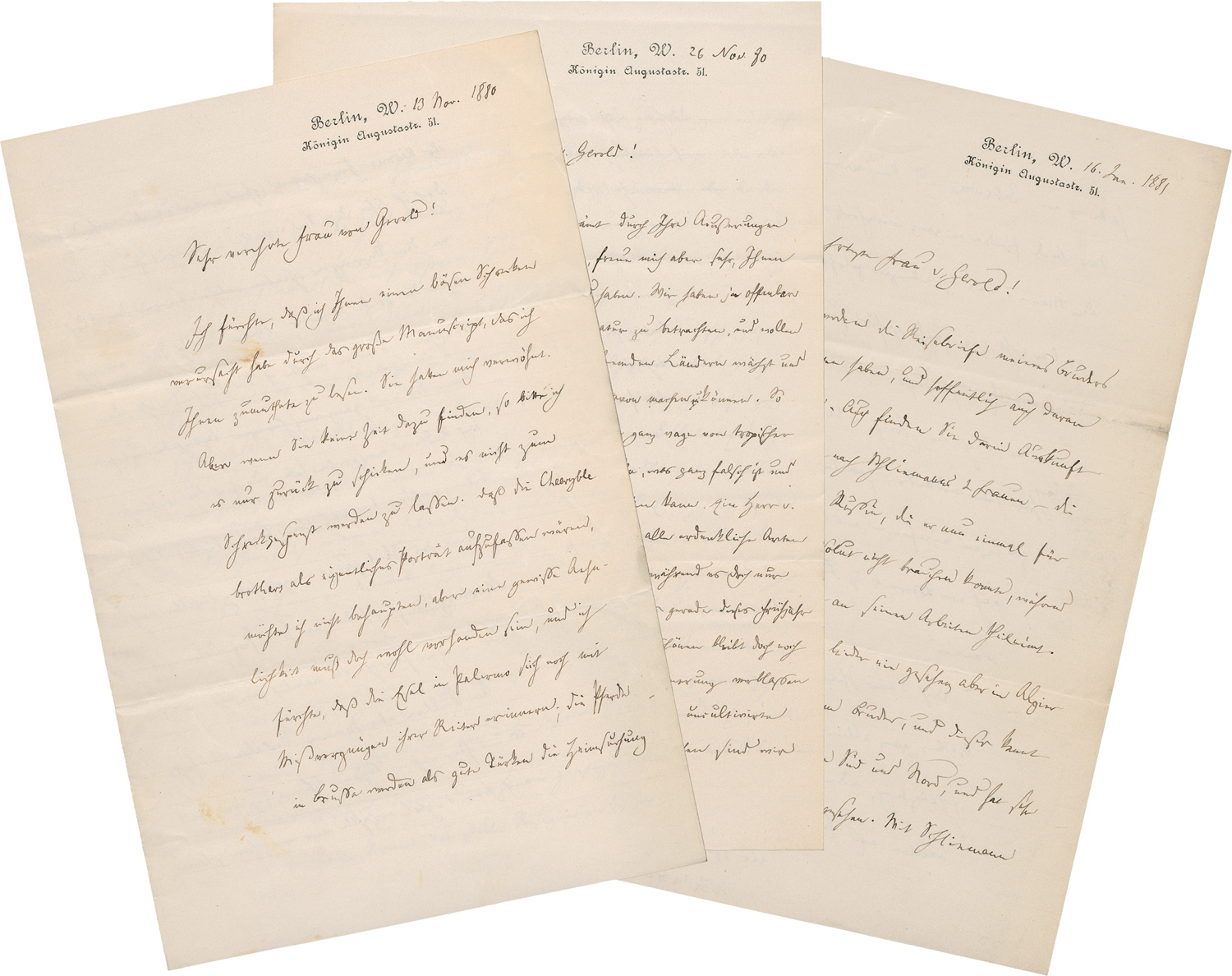 Umfangreiche, über nahezu zehn Jahre geführte Korrespondenz an Rosa von Gerold (1829-1907) in Wien, in der sich persönliche und kulturhistorische Themen mischen. Wattenbach schreibt u. a. über seine Reisen in Italien und Griechenland ("Corfu kenne ich bisher nicht, es soll ja ganz paradiesisch schön sein ...die Akropolis bleibt immer schön, ganz vorzüglich auch bei Mondenschein"), über den gemeinsamen Bekannten Heinrich Schliemann (1822-1890), den Archäologen und Entdecker des mythischen Troja, dessen Brief er ihr mit "besonderem Vergnügen" übersendet, sowie über literarische und familiäre Angelegenheiten. Ein Kondolenzschreiben aus Halle vom 8. Oktober 1884 bezeugt seine Anteilnahme am Tod ihres Gatten: "In meiner größten Bestürzung erfahre ich eben...die erschütternde Nachricht....Gestatten Sie mir den Ausdruck meiner tiefgefühlten Teilnahme - ich fühle mich außer Stande, noch weitere Worte darüber hinzuzufügen." Weitere Schreiben zeugen von persönlicher Anteilnahme, familiären Mitteilungen und einem geistigen Austausch über ihre Werke, um deren Zusendung er mehrfach ersucht.