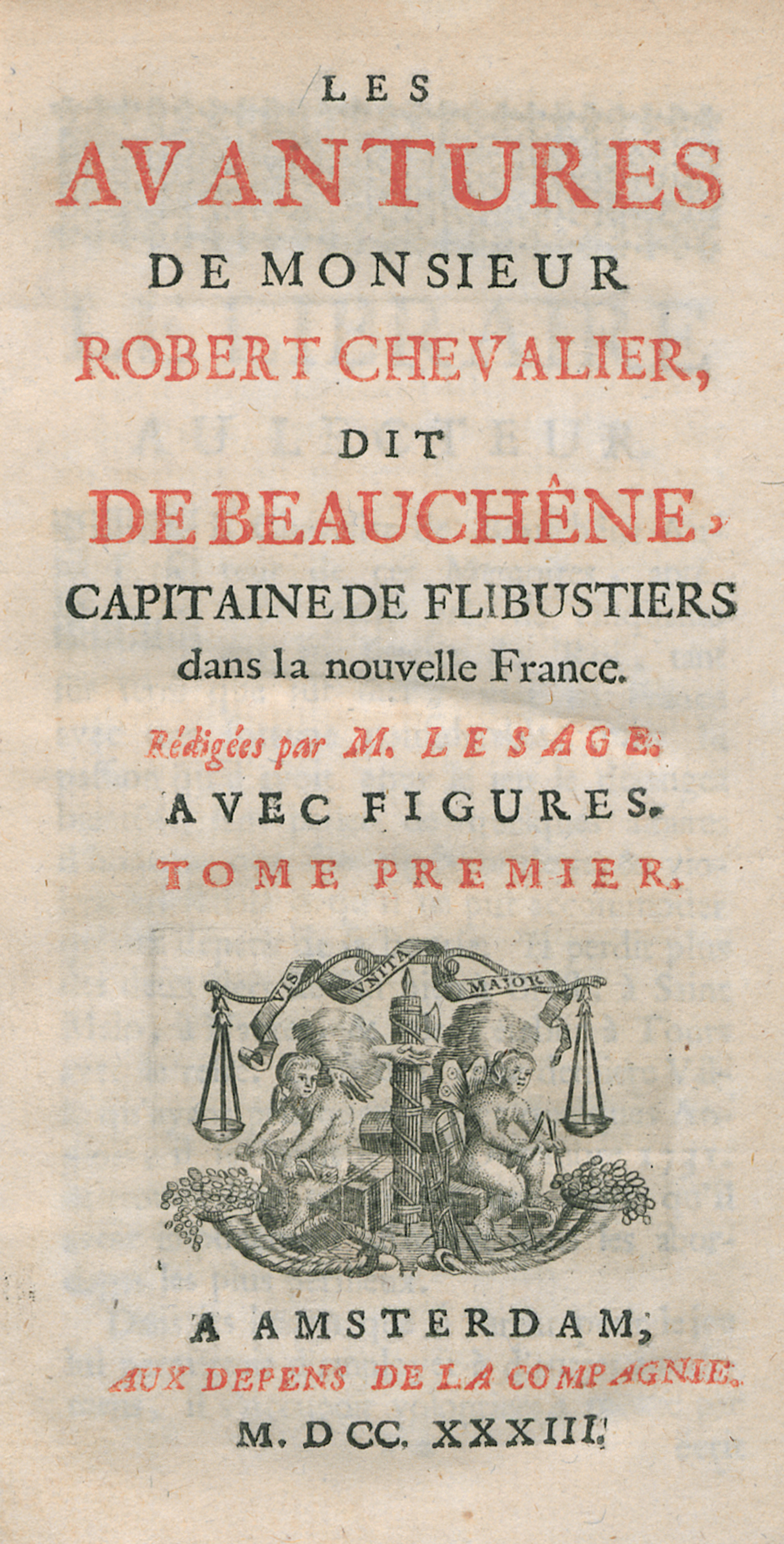 Le Sage, Alain René. Les avantures de Monsieur Robert Chevalier, dit de Beauchene, capitaine de Flibustiers dans la nouvelle France. 2 Teile in 1 Band. 5 Bl., 199 S.; 3 Bl., 187 S. Titel in Schwarz und Rot. Mit 2 wiederholten gestochenen Titelvignetten und 6 Kupfertafeln. 18 x 10,5 cm, Interimsbroschur d. Z. (Gebrauchsspuren). Amsterdam, Aux dépens de la Compagnie, 1733.