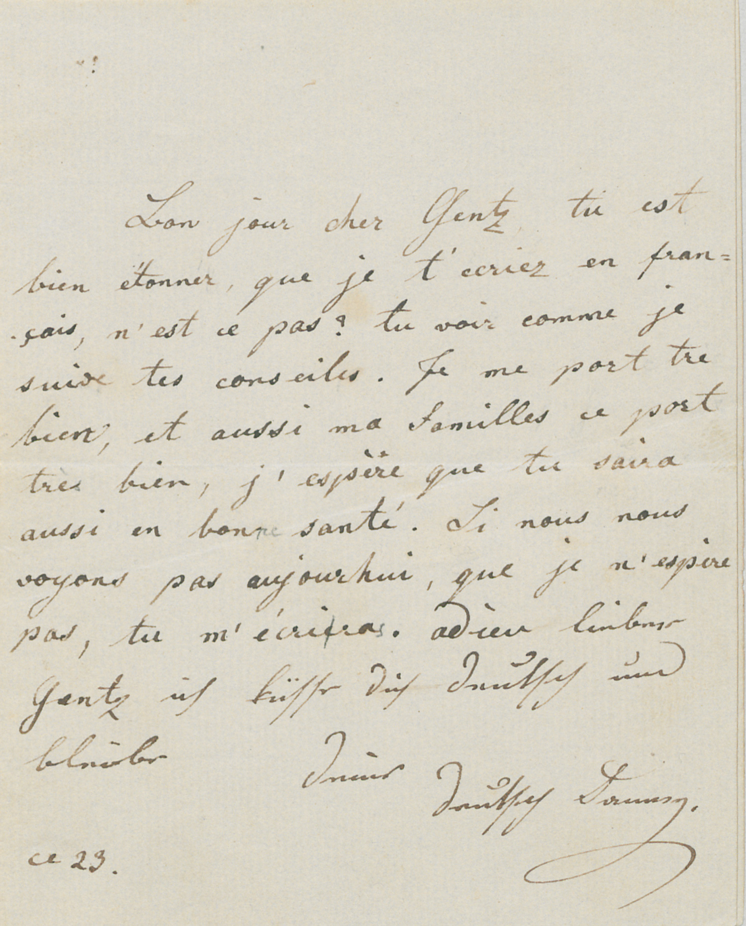 Reizender kleiner Liebesbrief der jungen Tänzerin an ihren glühenden Verehrer und Liebhaber Friedrich von Gentz (1764-1832), den über 60jährigen prominenten Politiker, Staatstheoretiker und Schriftsteller, Berater des Fürsten Metternich. In noch fehlerhaftem Französisch geschriebenes Briefchen, welches erkennen läßt, daß die Talente der europaweit umschwärmten Ballerina sich noch nicht im Schreiben französischer Briefe manifestierten. "Bonjour cher Gentz tu est bien étonner, que je t'ecriez en français, n'est-ce pas? Tu vois comme je suive tes conseiles. Je me porte tre bien, et aussi ma familles ce port très bien ... Si nous nous voyons pas aujourdhui, que je n'espère pas, tu m'écriras. adieu lieber Gentz ich küsse Dich deutsch und bleibe Deine deutsch Fanny." - Offenbar hatte Gentz ihr geraten, auf Französisch zu schreiben, damit der Inhalt ihrer Briefe nicht für jedermann sofort verständlich ist. Einige Worte aus vorliegendem Brief zitiert Emil Pirchan in seiner Elssler-Biographie (1940) und fügt hinzu: "Von Fannys Briefen an Gentz sind nur wenige erhalten, er vernichtete sie, weil - sie unorthographisch geschrieben waren! Deshalb gab er ihr, dem wenig gebildeten Wiener Vorstadtmädel, Unterricht in deutschem Stil und in französischer Sprache - er erzog sie, wie ein 'geliebtes Kind'."