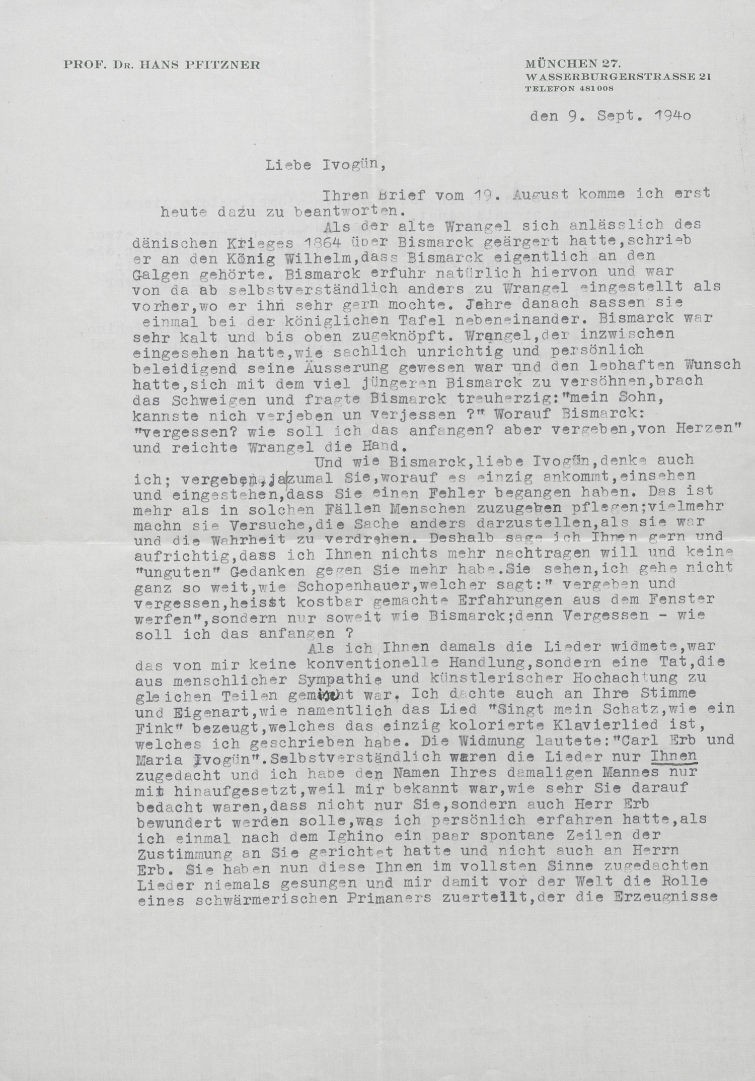 Umfangreicher Brief an die Sängerin Maria Ivogün (1891-1987, Sopranistin, Primadonna der Münchener Oper, "eine der schönsten Koloraturstimmen des 20. Jahrhunderts"). Ausführlich über einen lange zurückliegenden Konflikt mit der Sängerin, für dessen Veranlassung sie jetzt um Verzeihung gebeten hatte. Pfitzner hatte 1923 sein op. 33 ("Alte Weisen") mit Widmung an Maria Ivogün und ihren damaligen Ehemann Karl Erb versehen, die Uraufführung jedoch, weil der Ivogün der Termin nicht passte, einer anderen Sängerin überlassen. Daraufhin ignorierte die bewidmete Frau Ivogün diese Lieder demonstrativ über Jahrzehnte, bis der vorliegende Brief Pfitzners eine Versöhnung anbahnte. "... Als ich Ihnen damals die Lieder widmete, war das von mir keine konventionelle Handlung, sondern eine Tat, die aus menschlicher Sympathie und künstlerischer Hochachtung zu gleichen Teilen gemischt war. Ich dachte auch an Ihre Stimme und Eigenart, wie namentlich das Lied 'Singt mein Schatz, wie ein Fink' bezeugt, welches das einzig kolorierte Klavierlied war, welches ich geschrieben habe ... Sie haben nun diese Ihnen im vollsten Sinne zugedachten Lieder niemals gesungen und mir damit vor der Welt die Rolle eines schwärmerischen Primaners zugeteilt, der die Erzeugnisse seiner Feder einer angebeteten Diva widmet, welche diese natürlich niemals singt. Da ich auf meinen Namen auch etwas halte, hatte ich seinerzeit meinen Verleger angewiesen, die Doppelwidmung ganz zu streichen. Aber jetzt, nachdem wir versöhnt sind, soll sie wiederhergestellt werden und zwar nur Ihr Name, keine Doppelwidmung mehr. Ich werde Sie also fortan als Ighino, Christelflein und sogar als Agnes, die Sie ein einziges Mal gesungen haben, in Erinnerung bewahren, aber auch als Maria Ivogün ...". - Wie tief die Primadonnenlaune Pfitzner seinerzeit gekränkt hatte, wird aus einer Anekdote um Bismarck und Wrangel erkennbar, mit der Pfitzner etwa die erste Hälfte des Briefes füllt, um seinen Standpunkt "Nicht vergessen, aber verzeihen" zu motivieren. - Vgl. über den Konflikt auch W. Abendroth, Hans Pfitzner, S. 365.