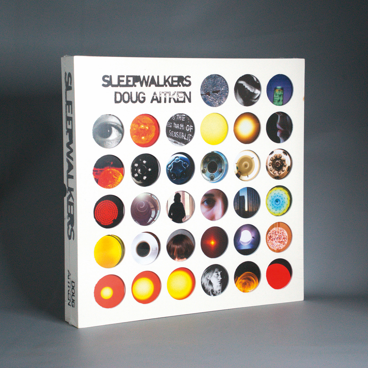 Aitken, Doug. The Sleepwalkers Box. Begleitbuch, Poster, Schallplatte, 2 Flipbooks etc. 32 x 32. In weißlackierter Sperrholzbox mit 33 kreisrunden Ausstanzungen. Princeton, Architectural Press, 2012.