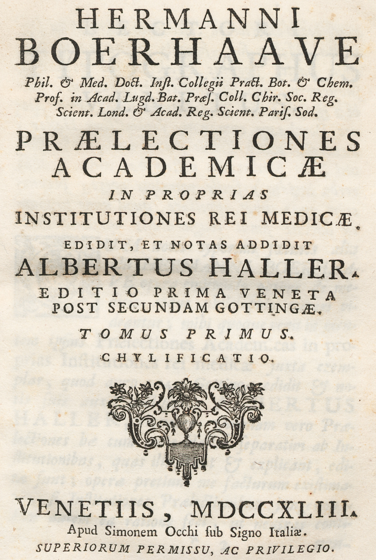Boerhaave, Herman. Praelectiones academicae. In proprias institutiones rei medicae. Edidit, et notas addidit Albertus Haller. 6 Teile in 7 Bänden. 24 x 18 cm. Interims-Pappbände d. Z. (fleckig und berieben, Rücken teils etwas lädiert) mit hs. RTitel. Venedig, Simon Occhi, 1743-1745.