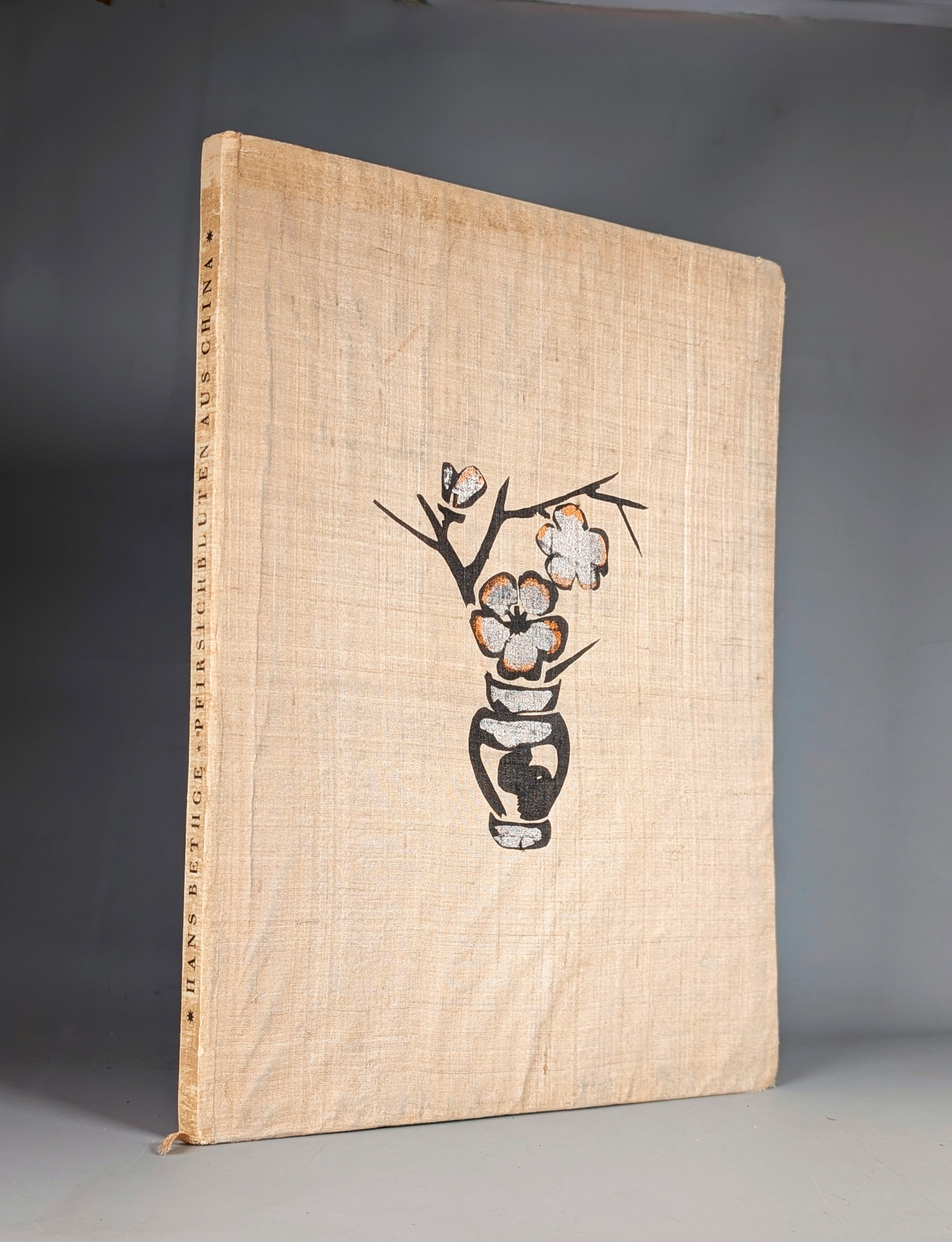 Bethge, Hans. Pfirsichblüten aus China. Nachdichtungen chinesischer Lyrik. 97 S. Mit farbig lithographiertem Titel sowie 10 Original-Farblithographien von Bernhard Hasler. 35 x 25,5 cm. Seide d. Z (leicht fleckig und lichtrandig) mit RTitel und DIllustration. Berlin, Rowohlt, 1920.