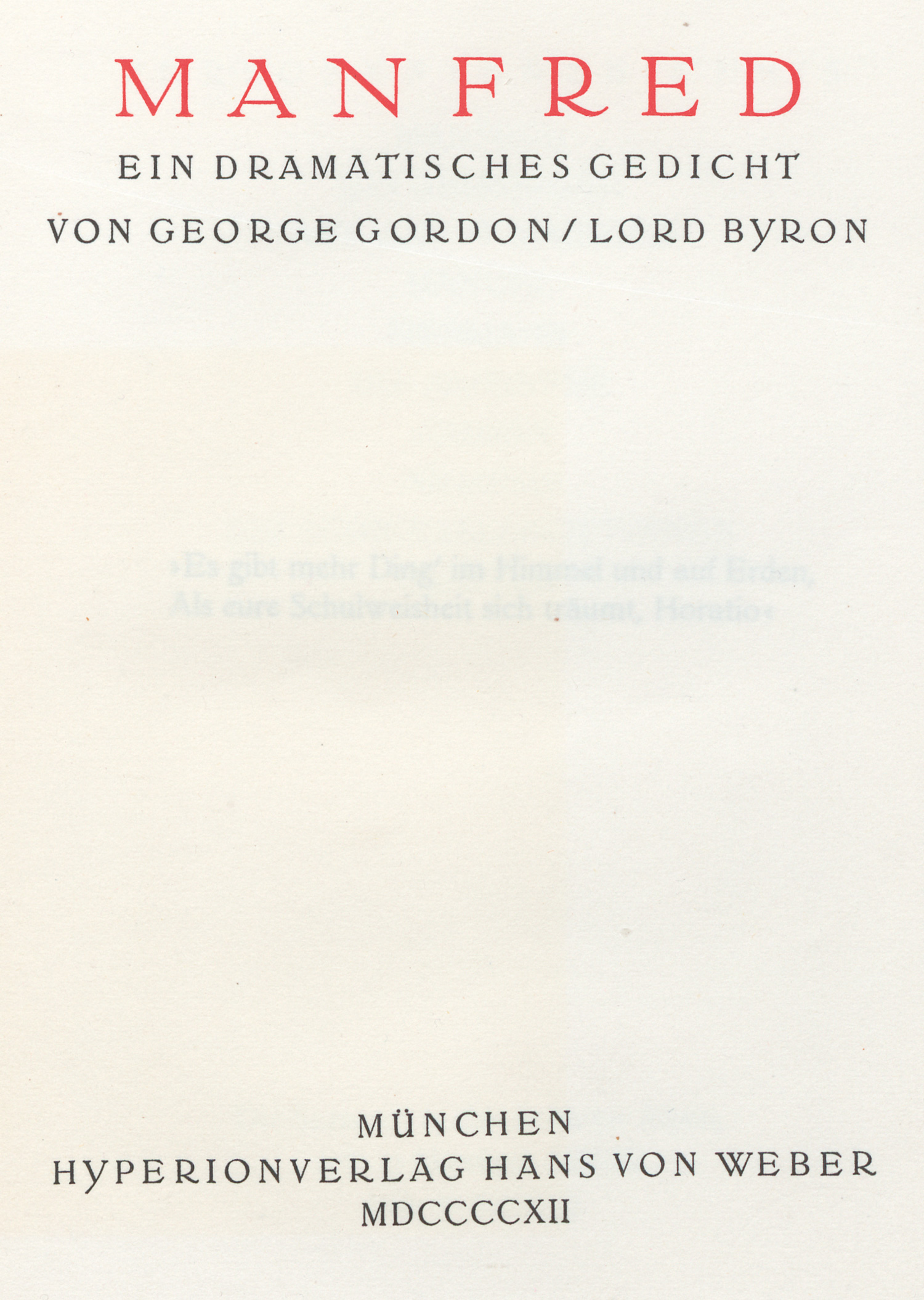 Byron, George Gordon. Manfred. Ein dramatisches Gedicht. (Deutsche Übertragung von Woldemar Starke). 4 Bl., 140 S., 2 Bl. 28 x 19 cm. Marmorierter OPappband mit Rücken- und Deckelschild. München, Hyperionverlag Hans von Weber, 1912.