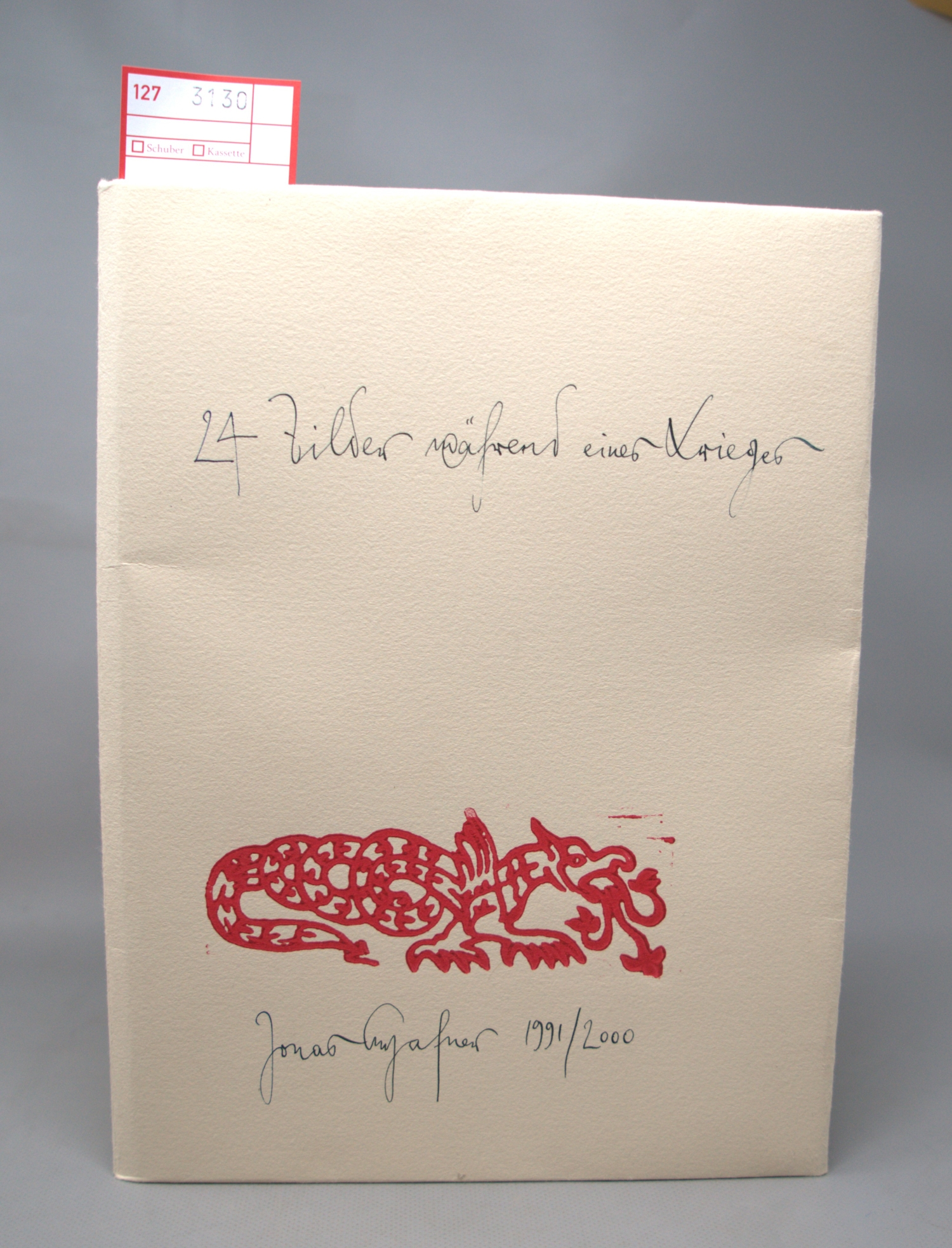 Hafner, Jonas. 24 Bilder während eines Krieges (Umschlagtitel). Mars auf Reisen. Folge von 24 farbigen Lithographien. 29,5 x 21 cm. Lose Blätter in OUmschlag mit hs. Titel und 2 Deckelillustrationen in OHolzschnitt. Hamburg, Edition Griffelkunst, 2000.
