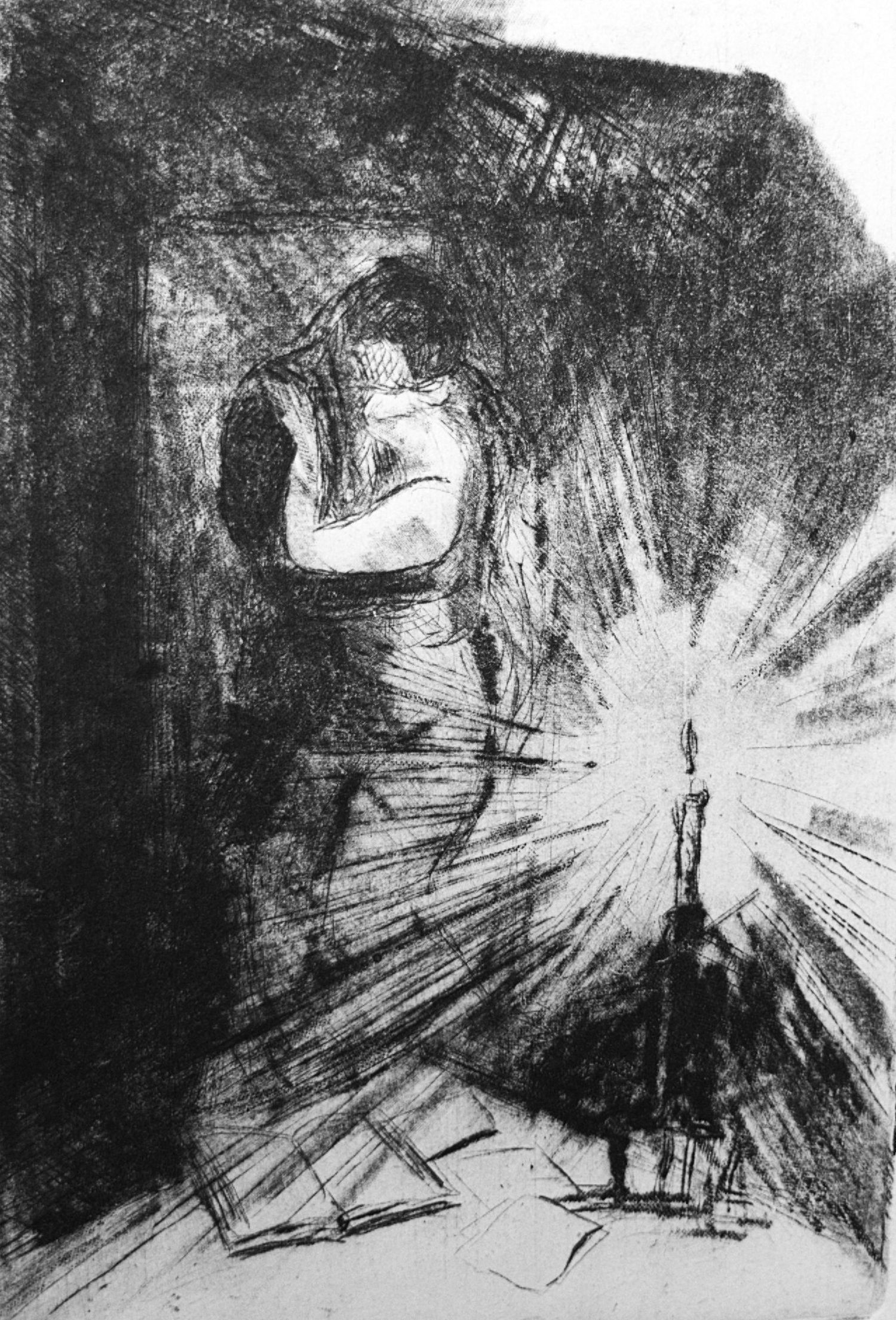 Heine, Heinrich. Traumbilder. 76 S., 2 Bl. Mit 17 signierten Originalradierungen von Walter Wellenstein. 18,5 x 12,5 cm. OLeder (Vorderdeckel mit Druckstelle) mit goldgepr. Deckelvignette und RTitel. Berlin-Zehlendorf, F. Heyder, (1924).