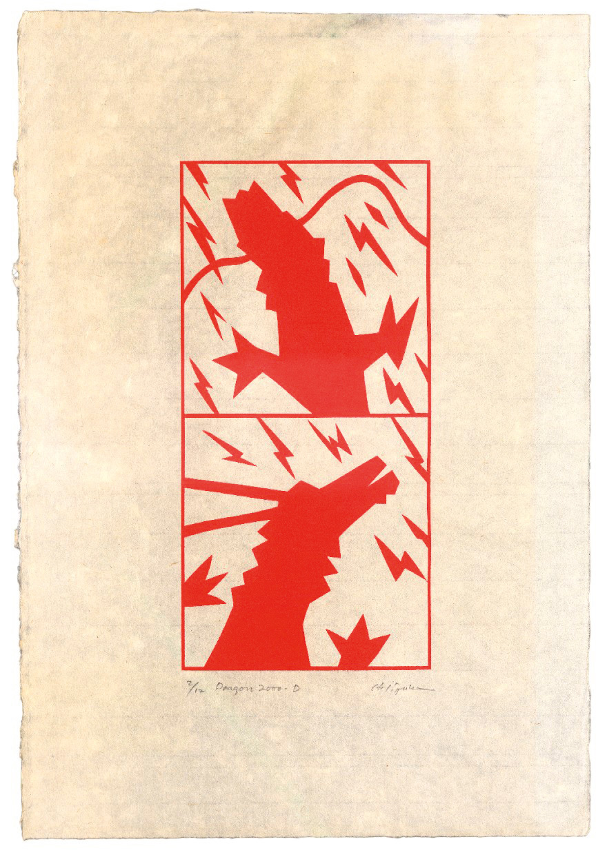 Iizuka, Hashiro. "Dragon". Folge von 20 Lithographien in Orange auf Japan mit Drachenmotiven, alle unten in Bleistift signiert, betitelt und mit Auflagenbezeichnung. Lose Bogen. Blattmaß je ca. 53,5 x 37 cm. Japan 2000.