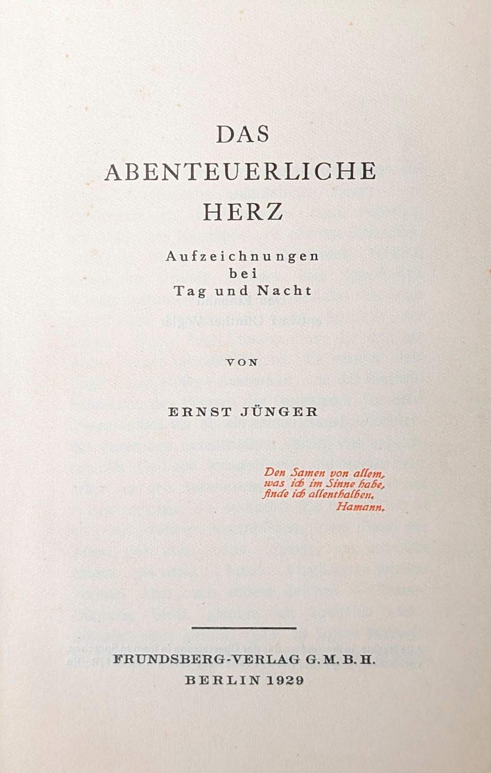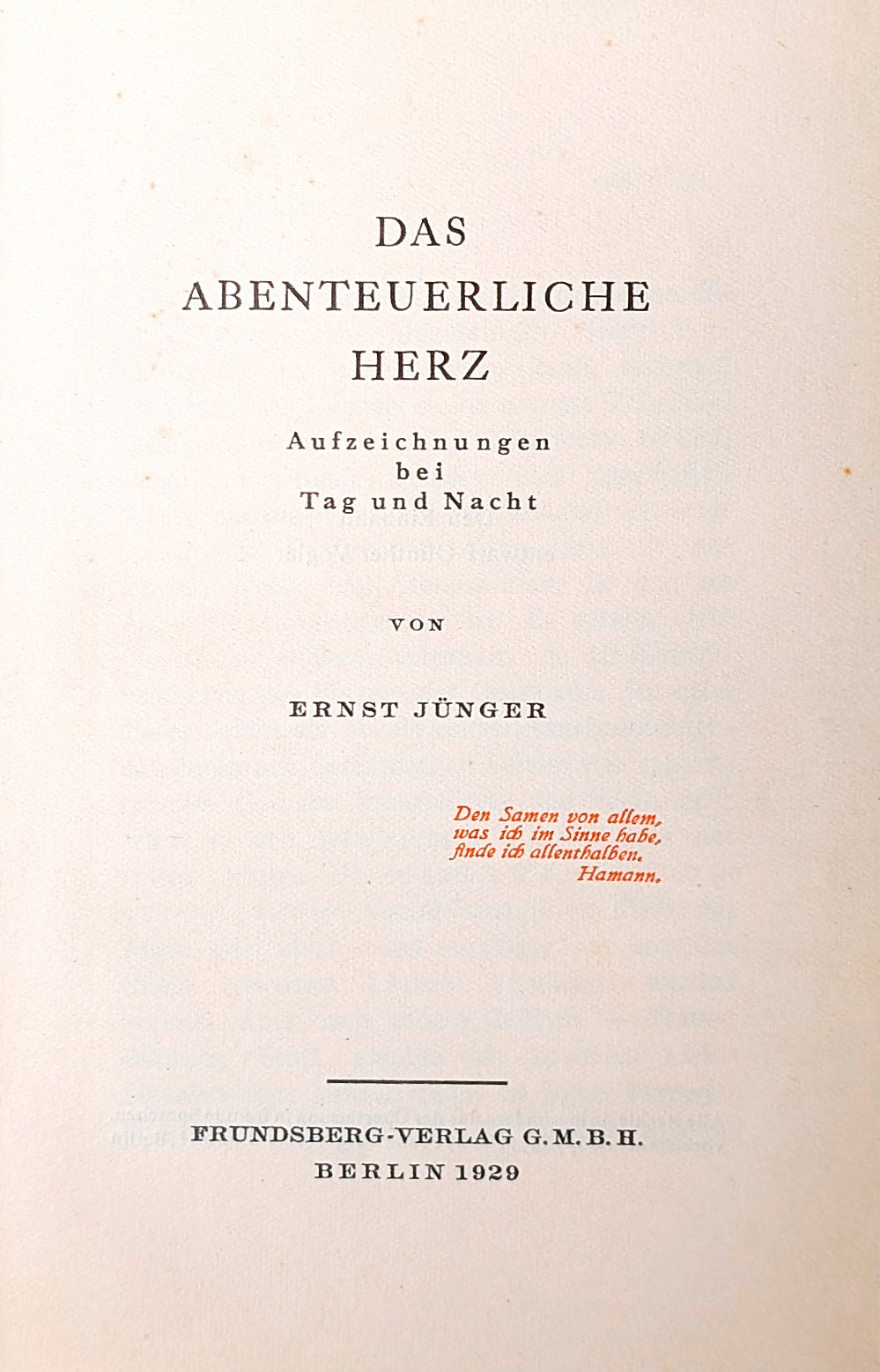 Jünger, Ernst. Das abenteuerliche Herz. Aufzeichnungen bei Tag und Nacht. 263 S. 17 x 11 cm. Moderner roter Maroquinband mit goldgepr. RTitel. Berlin, Frundsberg-Verlag, 1929.