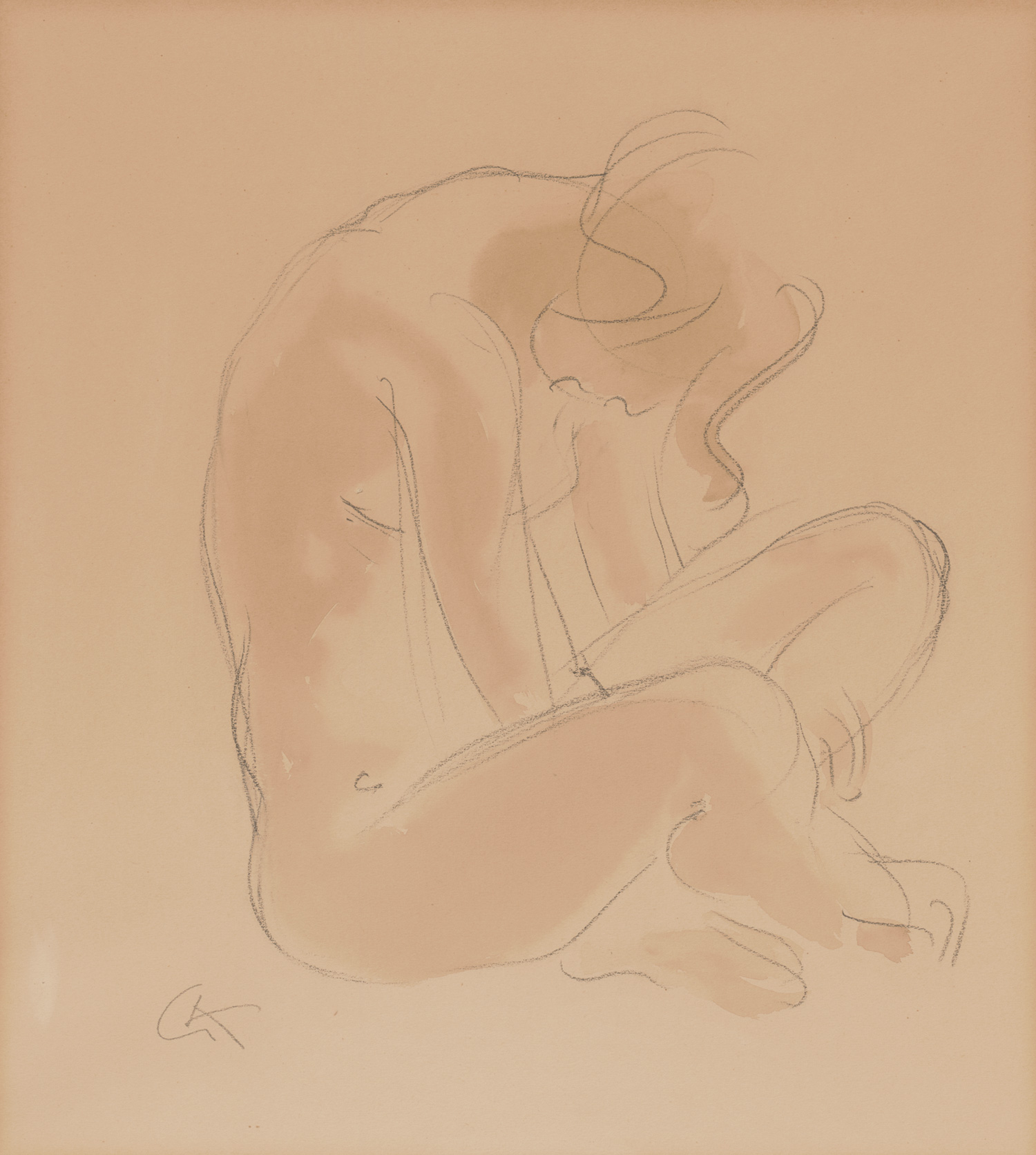 Kolbe, Georg. Kauernder Akt. Bleistift mit Sepiatusche auf Papier. Unten links monogrammiert "GK". 38 x 34 cm (Passepartoutausschnitt). Mit Karton-Passepartout unter Glas in schlichte Holzrahmenleiste 66,5 x 51,5 cm. Um 1922.