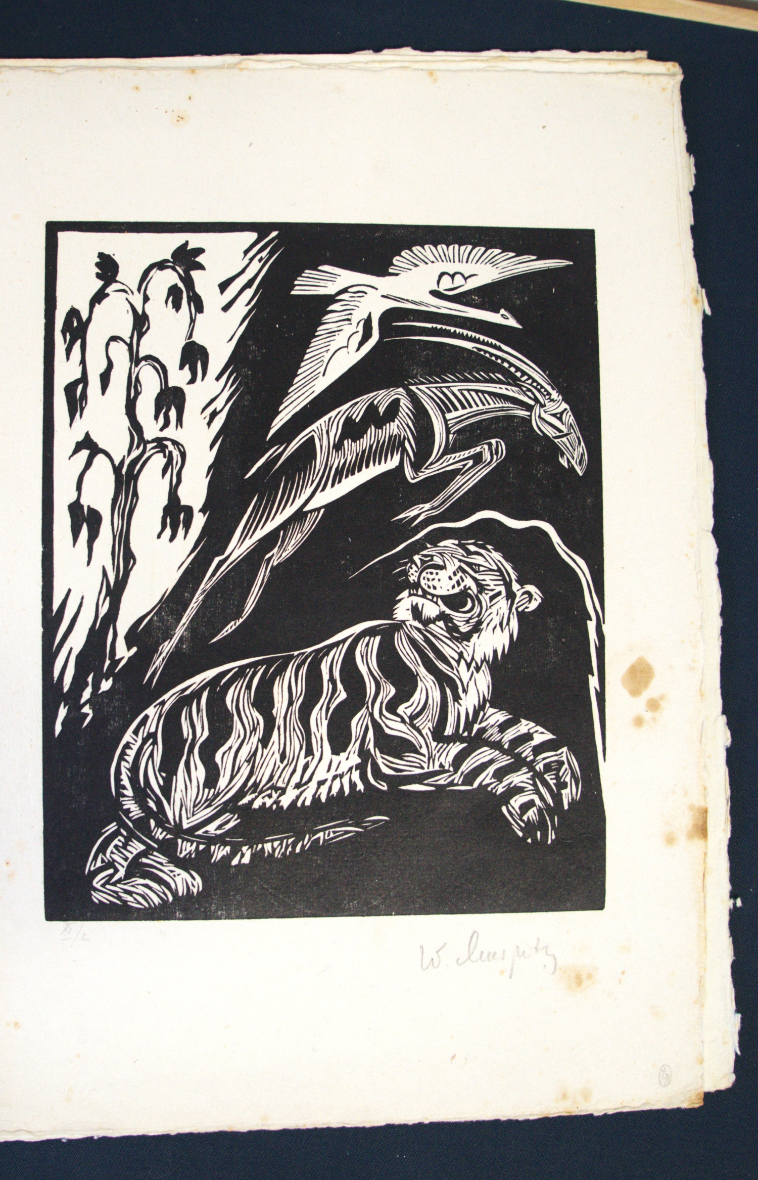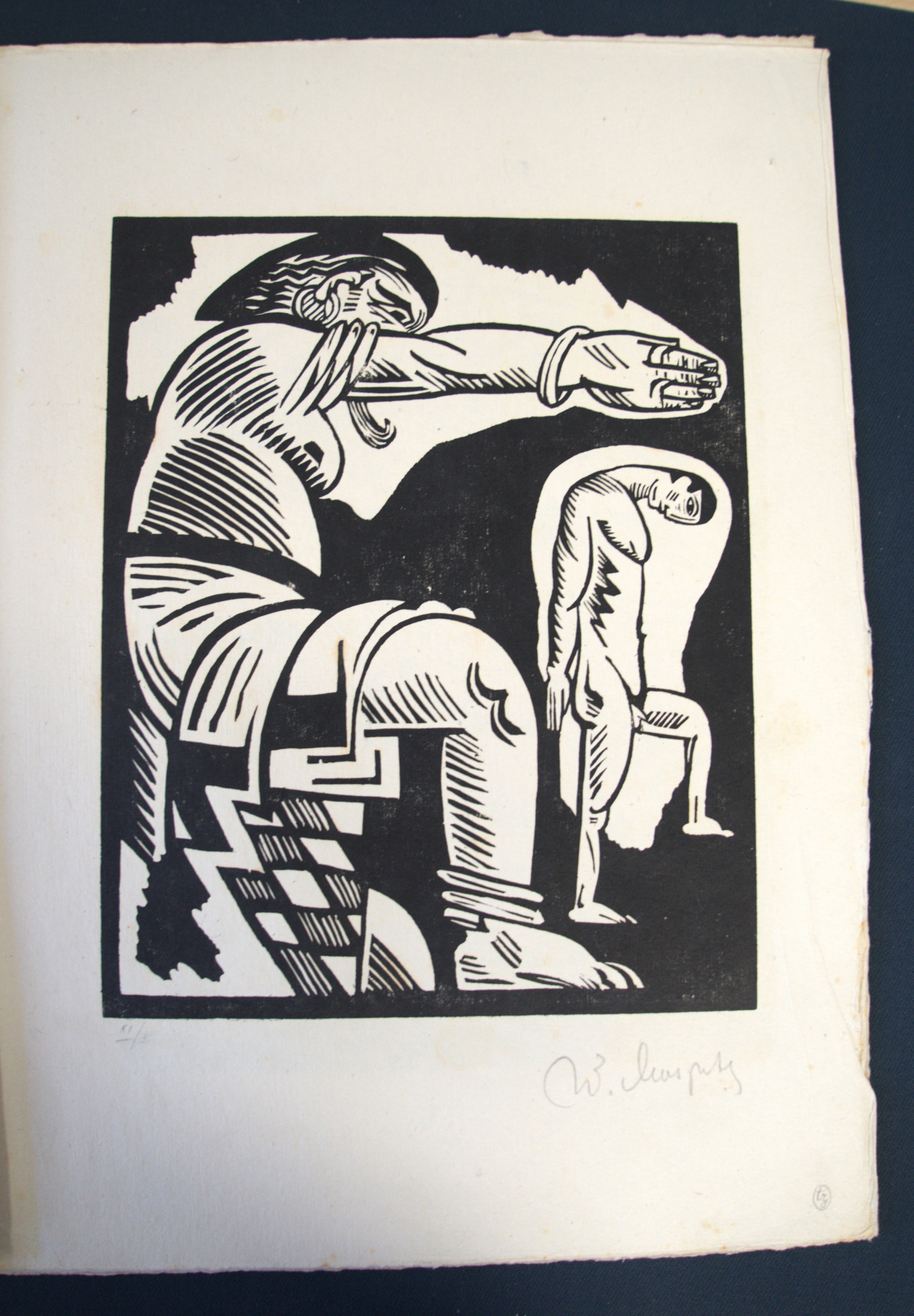 Puschkin, Alexander S. Der Antiar (Giftbaum). Mit 6 signierten Originalholzschnitten von W. Masjutin. 48 x 34,5 cm. OBroschur (berieben, fleckig und unterers Kapital mit Einriss) in Fadenbindung mit DTitel. Berlin, Newa, 1922.
