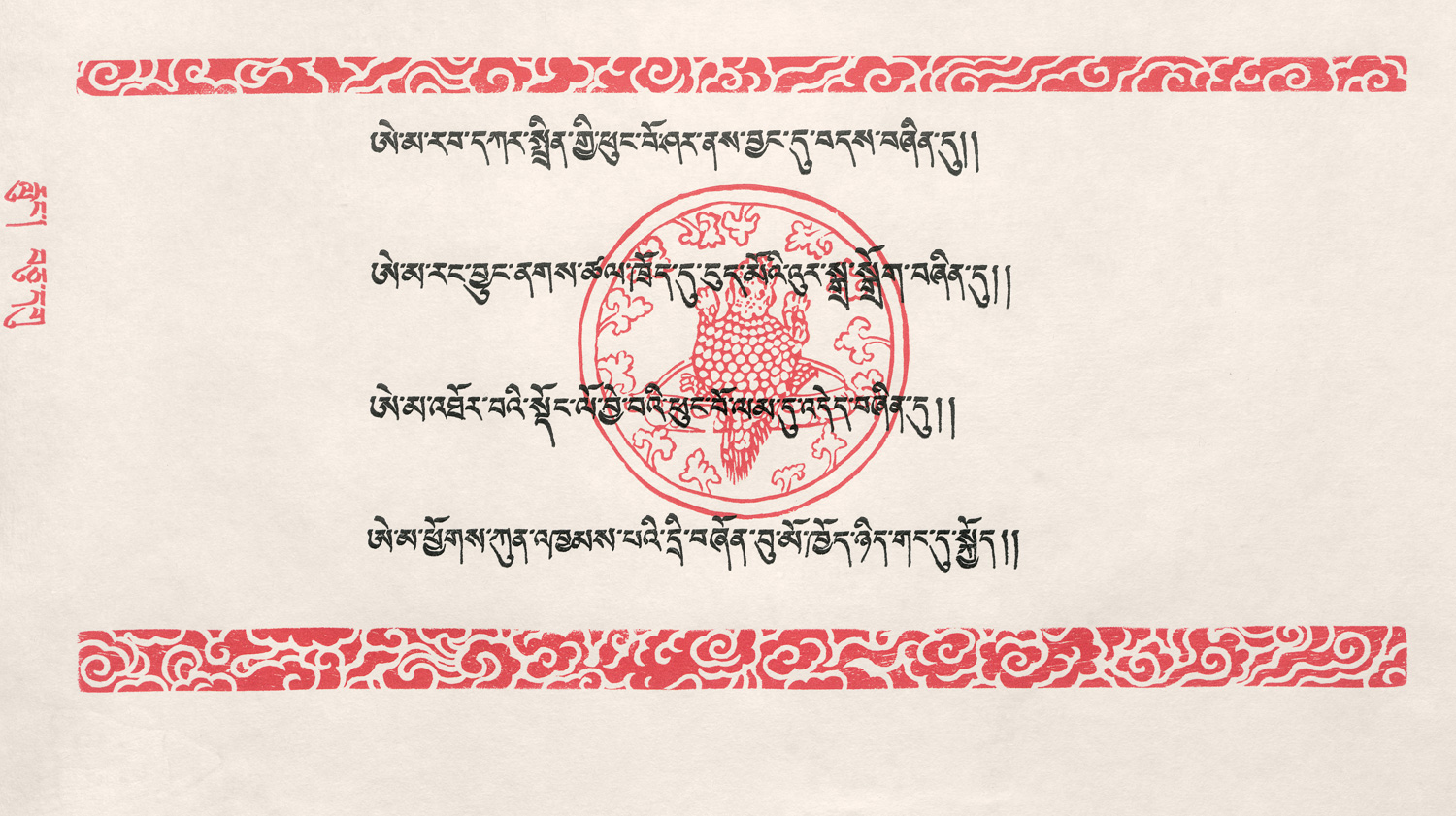 Edition Kaldewey 26. Edition Kaldewey 26. Von Lucius 225. – Eines von 45 Exemplaren (Gesamtauflage 55). Die Bordüren und Holzschnitte zeigen tibetischen Glückssymbole und wurden in Rot, Gelb, Grün und Blau auf handgeschöpftem Büttenpapier der Presse gedruckt, der Text in Schwarz. Die englische Übersetzung mit montierten Streifen aus tibetischem Drachenpapier an der Seite. Die losen Blätter sind einseitig bedruckt und folgen der traditionellen tibetischen Buchform.