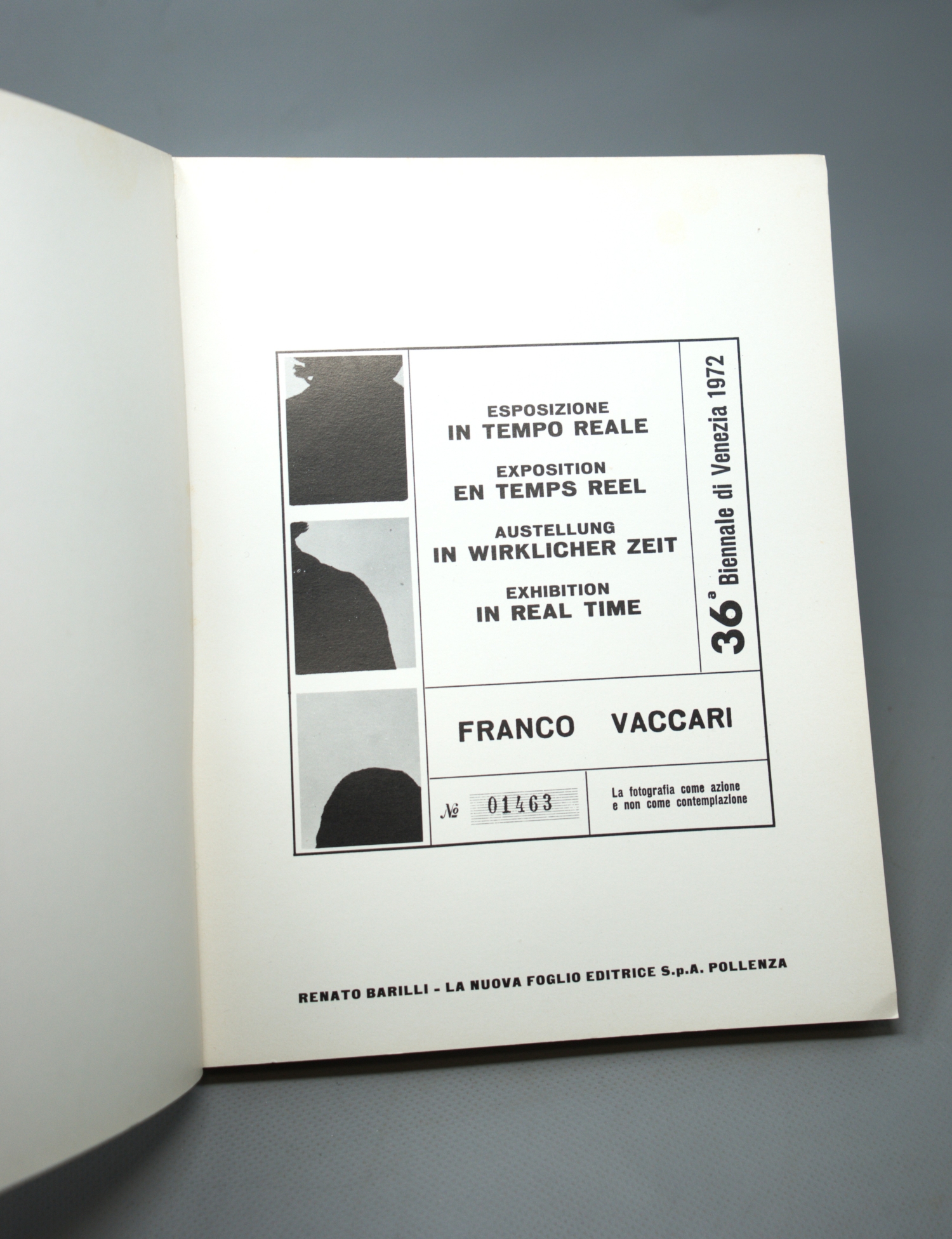 Vaccari, Franco. Esposizione in tempo reale. Exposition en temps réel. Ausstellung in wirklicher Zeit. Exhibition in Real Time. N° 01463. (Mit einem Vorwort von Renato Barilli). 170 Bl. Mit zahlreichen schwarz-weiß-Abbildungen. Farbig illustrierter OPappband (etwas fleckig und berieben) mit schwarzem Leinenrücken. Pollenza, La Nuova Foglio Editrice, 1972.