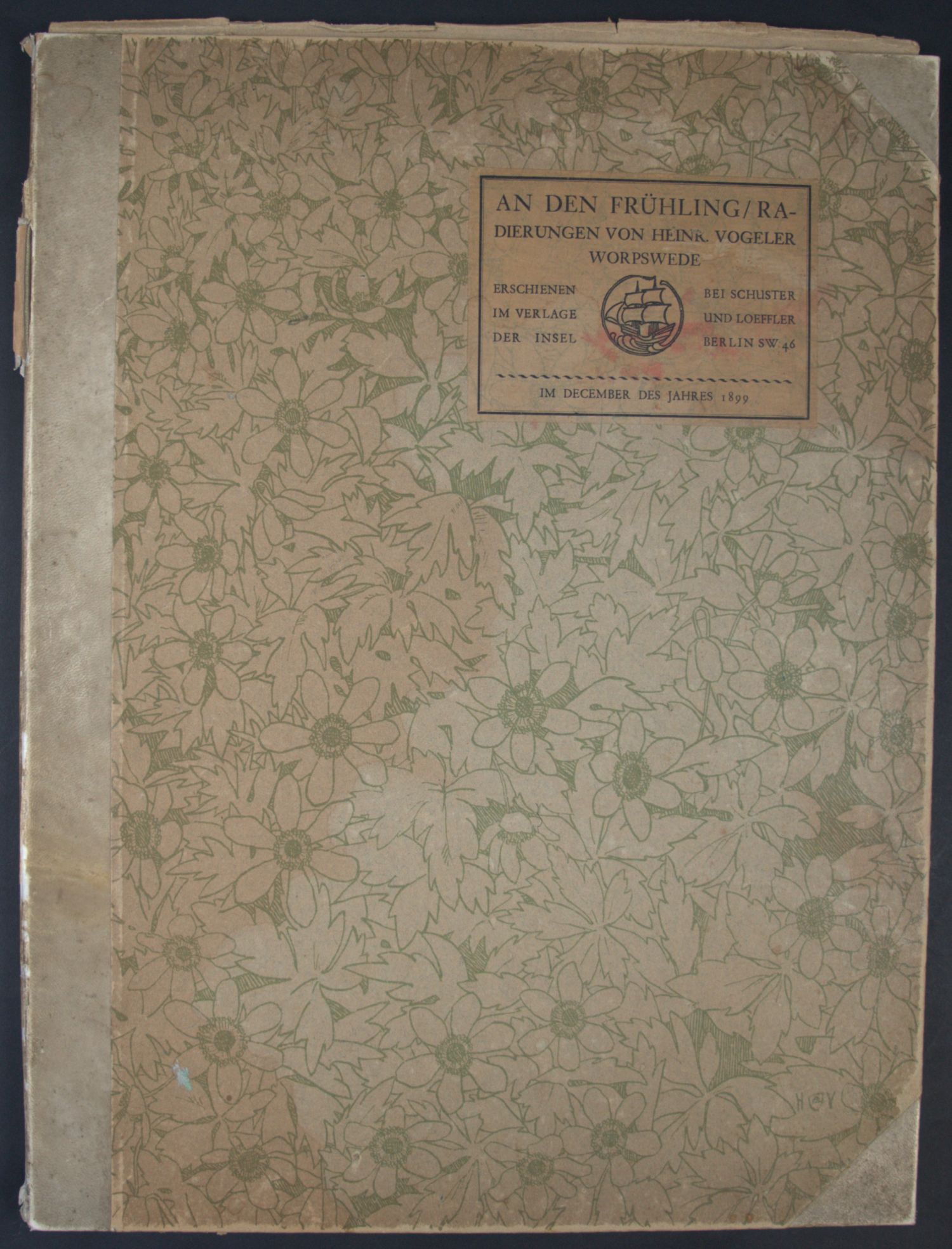 Vogeler, Heinrich. An den Frühling. Titelblatt und 10 Original-Radierungen auf festem Van-Gelder-Büttenkarton. Radierungen ca. 16 x 15 cm (Plattenrand). Format ca. 28 x 24,5 cm (Blattgröße). Lose Tafeln in OHalbpergament-Mappe (Rücken stärker lädiert, teils offen, mit Fehlstellen, angestaubt und fleckig, beschabt und bestoßen sowie berieben) mit montiertem Deckelschild auf von Vogeler entworfenem und signierten ("HV") floralen Buntpapier. Leipzig, Insel, (1899).