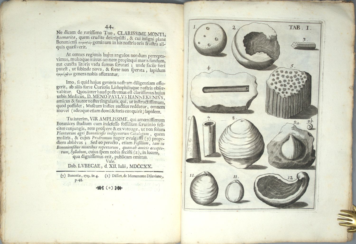 Melle, Jacob von. De lapidibus figuratis agri litorisque Lubecensis. 44 S., 4 Bl. Mit 4 Kupfertafeln. Titel in Rot und Schwarz. 24 x 18,5 cm. Geheftet (ohne Vorderdeckelbroschur). Lübeck, Struck, (1720).
