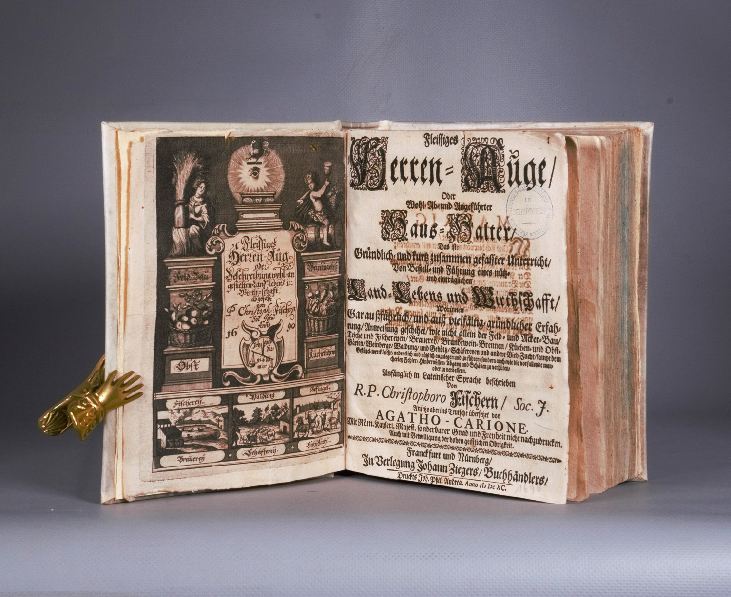 Fischer, Christoph. Fleissiges Herren-Auge, Oder Wohl- Ab- und Angeführter Haus-Halter. 2 Teile in 1 Band. 7 Bl., 296 S.; 3 Bl., 312 S. Mit 2 gestochenen Frontispizen und 12 Textkupfer sowie mehreren Holzschnittvignetten. 20 x 15 cm. Modernes Pergament (etwas fleckig und geworfen). Frankfurt und Nürnberg, Johann Zieger 1690.