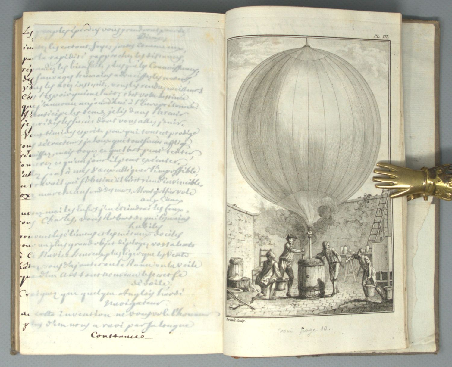 Die Rückseite der Tafeln in Bd. I enthält in zeitgenössischer Handschrift drei Gedichte (7 Seiten) von Gudin de la Brenellerie, Mitglied der Akademie von Marseille. "Als Zeitgenosse und glühender Bewunderer der Montgolfierschen Erfindung, knüpft er an sie die weitesten Hoffnungen für die Zukunft" (Jacobius, Luftschiff und Pegasus, S. 14). Es handelt sich um folgende Gedichte: I. "Sur le Globe ascendant du 27 aout 1783" (57 Verse). Dieses Gedicht stellt den "neuen Ikarus" noch über Columbus und Cook. Gudin erhofft die Vervollkommnung der Montgolfierschen Maschine durch Charles und Robert, "die sich eilen mögen, damit England nicht auch das Reich der Luft wie das des Wassers an sich reisse". Diese Spitzen gegen England haben Wieland in seinem berühmten Artikel (Deutscher Merkur 1783, S. 69) "Die Aeropetomanie" veranlasst, sich über die Aeronauten im allgemeinen und über die glühenden Verse Gudins im besonderen lustig zu machen. - II. "Vers adresses à M. Faujas de S. Fond" (68 Verse). - Diese beiden Gedichte sind abgedruckt im "Almanach des Muses", Jg. 1784, S. 25-27 und 177-79. - III. "Sur les voyages aeriens de MM. Charles et Robert" (100 Verse). Für dieses Gedicht konnten wir keinen gedruckten Nachweis feststellen. – Minimal fleckig, die Handschrift durchschlagend.