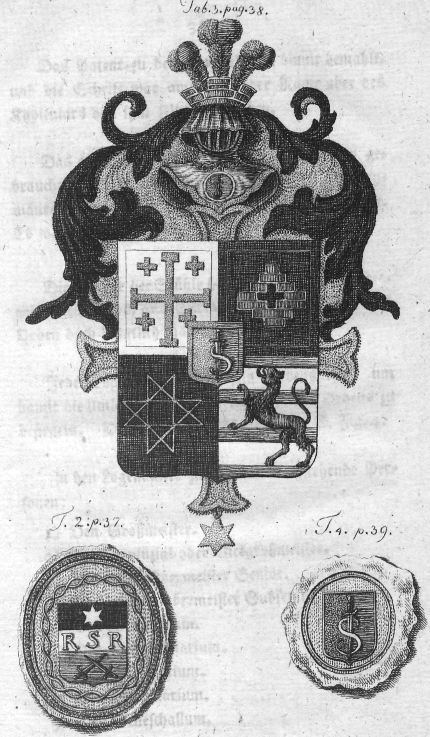 Der entdeckte Orden der afrikanischen Bauherren-Loge, nebst Beweise, das sie sich Kenntnisse der Alterthümer, besonders der Einweihungen legen. Teil I und II in 1 Band. 116 S., 1 Bl.; 51 S. Mit gestochener Kopfvignette, Holzschnitt-Kopfvignette und 3 Kupfertafeln. 19,5 x 11,5 cm. Moderner Pappband. Konstantinopel (d. i. Berlin, Schöne), 1806.