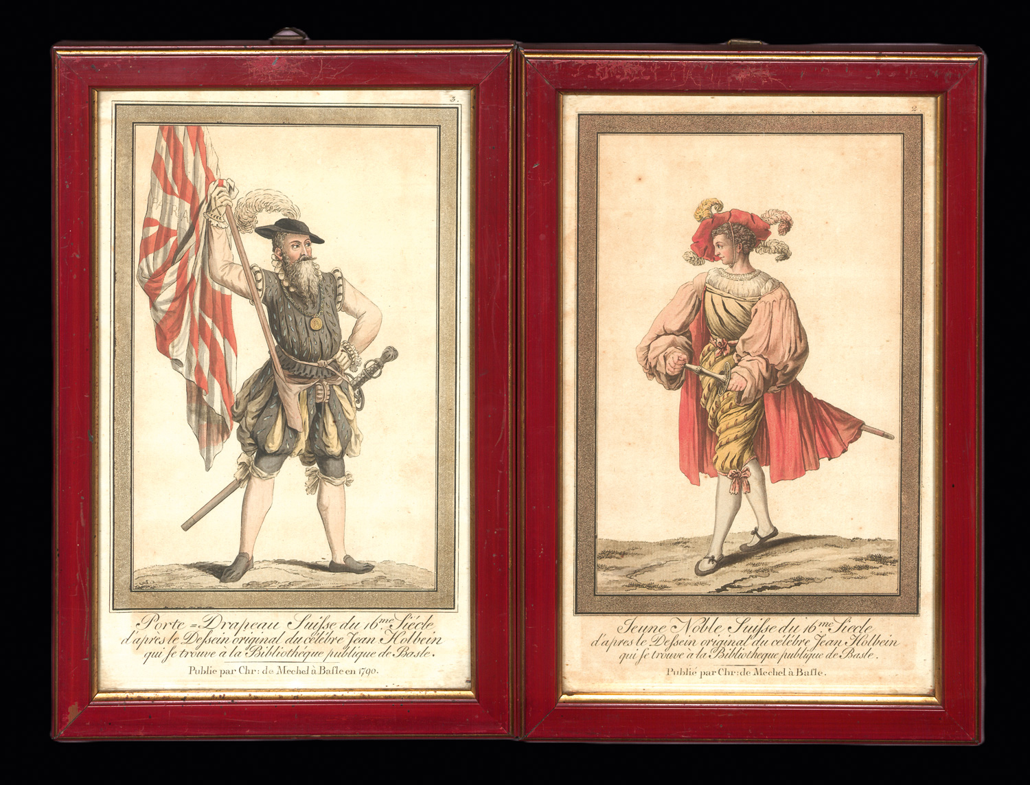 Sehr schöne und seltene Ansichten schweizer Kostüme von Christian Mechel (1737-1817). Dargestellt sind vier weibliche Kostüme von "Luisse" und vier männliche Kostüme von Soldaten, "Jeune Noble" und "Porte-Drapeur". Die vollständige Reihe besteht aus insgesamt zwölf Kupferstichen, je sechs weibliche und sechs männliche Darstellungen. – Papierbedingt gebräunt und etwas stockfleckig sonst gut erhalten. Sehr dekorativ und in feinen pastelligen Farben koloriert. Nicht ausgerahmt, Versand nur ohne Rahmen.