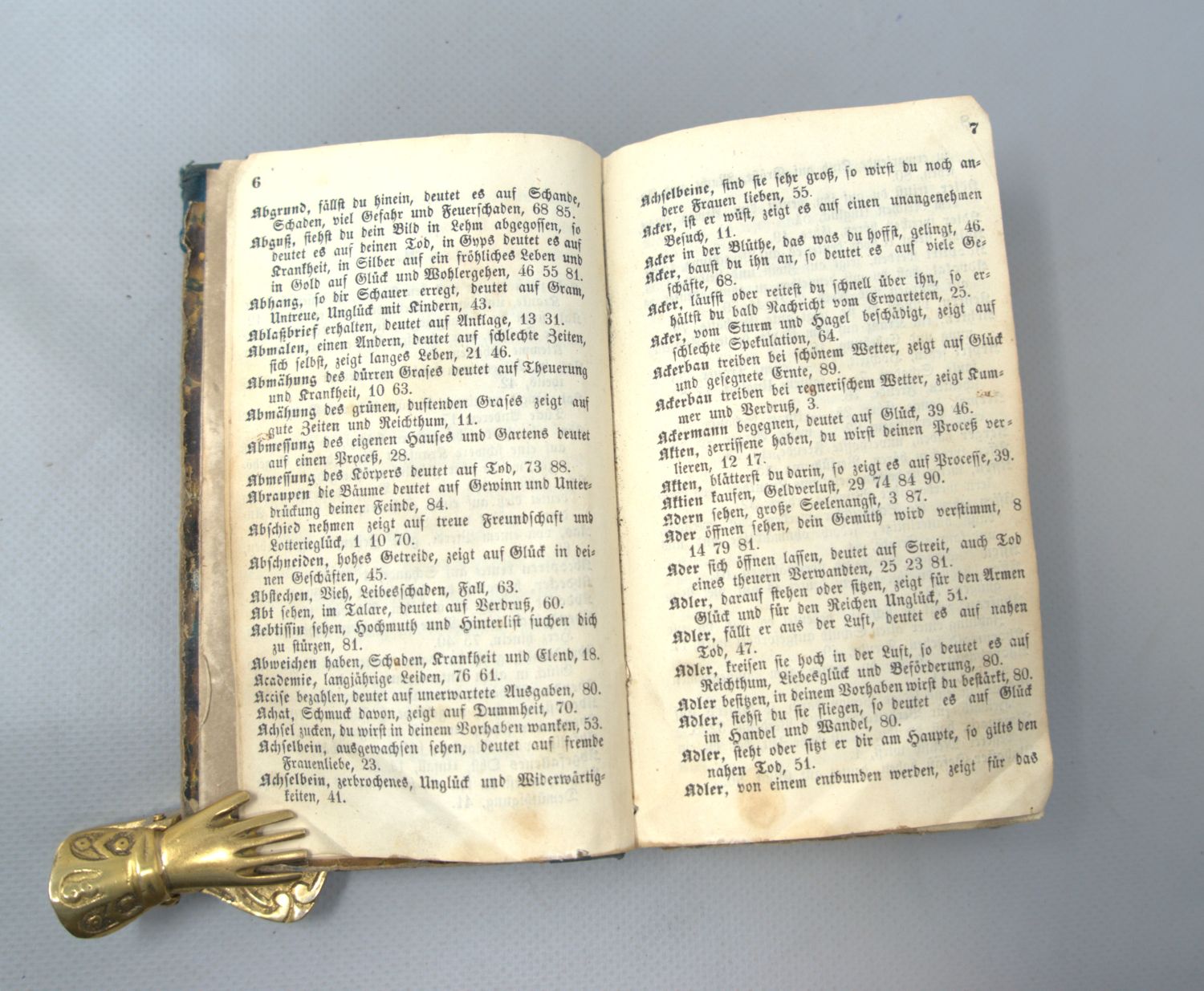 Neuestes Traum-Buch oder Anweisung Träume auszulegen. Zur Unterhaltung und Belustigung in Mußestunden. 167 S. Mit 90 kleinen Holzschnitten aus 8 Blättern. 16 x 9 cm. Halbleinen d. Z. (stark lädiert, mit mehreren Fehlstellen und Flecken). Brünn, C. Winiker, 1856.