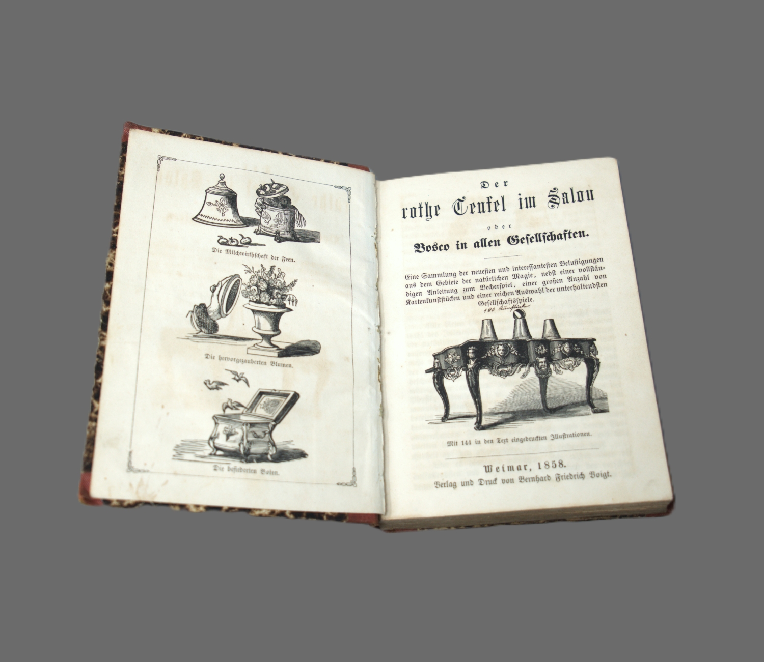 Der rothe Teufel im Salon oder Bosco in allen Gesellschaften. XVI, 265 S. Mit Frontispiz und 144 Textholzstichen. 17 x 12 cm. Halbleinen d. Z. (mit großem zeitgen. Etikett auf dem Vorderdeckel). Weimar, Voigt, 1858.