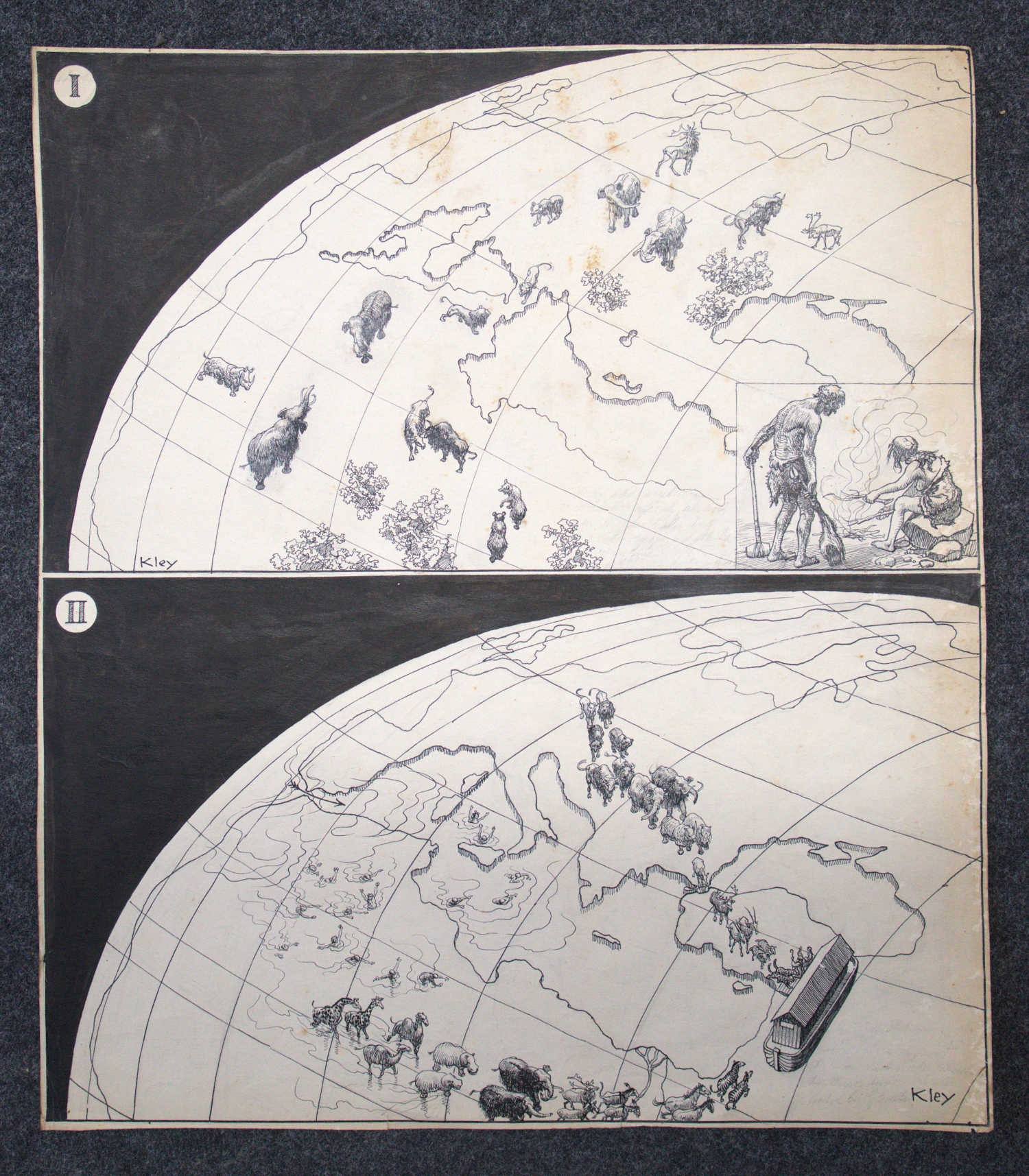 Originalzeichnungen des aus Karlsruhe stammende Zeichners und Malers Heinrich Kley (1863-1945) für das große Atlantropaprojekt Herman Sörgels. Ein Karton zeigt die historischen Voraussetzungen des Projekts, mit dem durch Austrocknung des Mittelmeeres die Kontinente von Europa und Afrika wieder vereint werden sollten, wie im alten Gondwana. Humoristisch zeigt Kley die freie Wanderung der Tiere über den einstigen Großkontinent und die mühsame Rettung derselben nach der Sintflut in der Arche Noas (Bilder I+II). Die zweite Schautafel zeigt die Strömungsbewegungen des Wasser im Atlantik: "Ausbreitung des kalten Wassers, das aus dem Mittelmeer strömt und wie ein Abwehrpolster den Golfstrom ablenkt". Sowie "Zentralheizung Europas durch den Golfstrom I., heute und II., nach Schliessung der Straße von Gibraltar durch einen Damm: Mitteleuropa bekommt ein wärmeres Klima". Ironie des Schicksals: das Eingreifen des Menschen in die Natur mit Großprojekten und Überindustrialisierung führte schon heute, nicht einmal ein Jahrhundert später zu einer thermischen Erhitzung des Kontinents und zur Veränderung des Golfstroms.