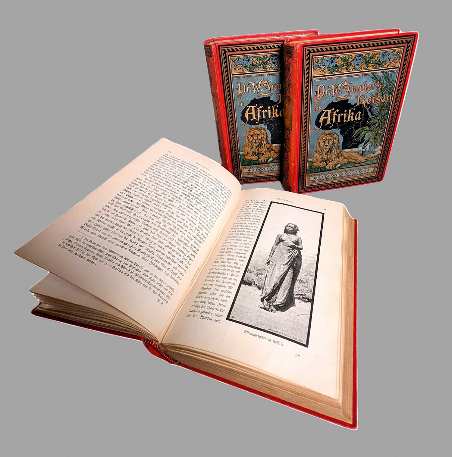 Junker, Wilhelm. Reisen in Afrika 1875-1886. Nach seinen Tagebüchern unter Mitwirkung von Richard Buchta herausgegeben. 3 Bände. Mit sehr zahlreichen Illustrationen im Text und auf Tafeln sowie einigen Karten. 22,5 x 15,5 cm. Illustrierte rote OLeinenbände (etwas berieben, Kapitale schwach bestoßen). Wien und Olmütz, Eduard Hölzel, 1889-1891.