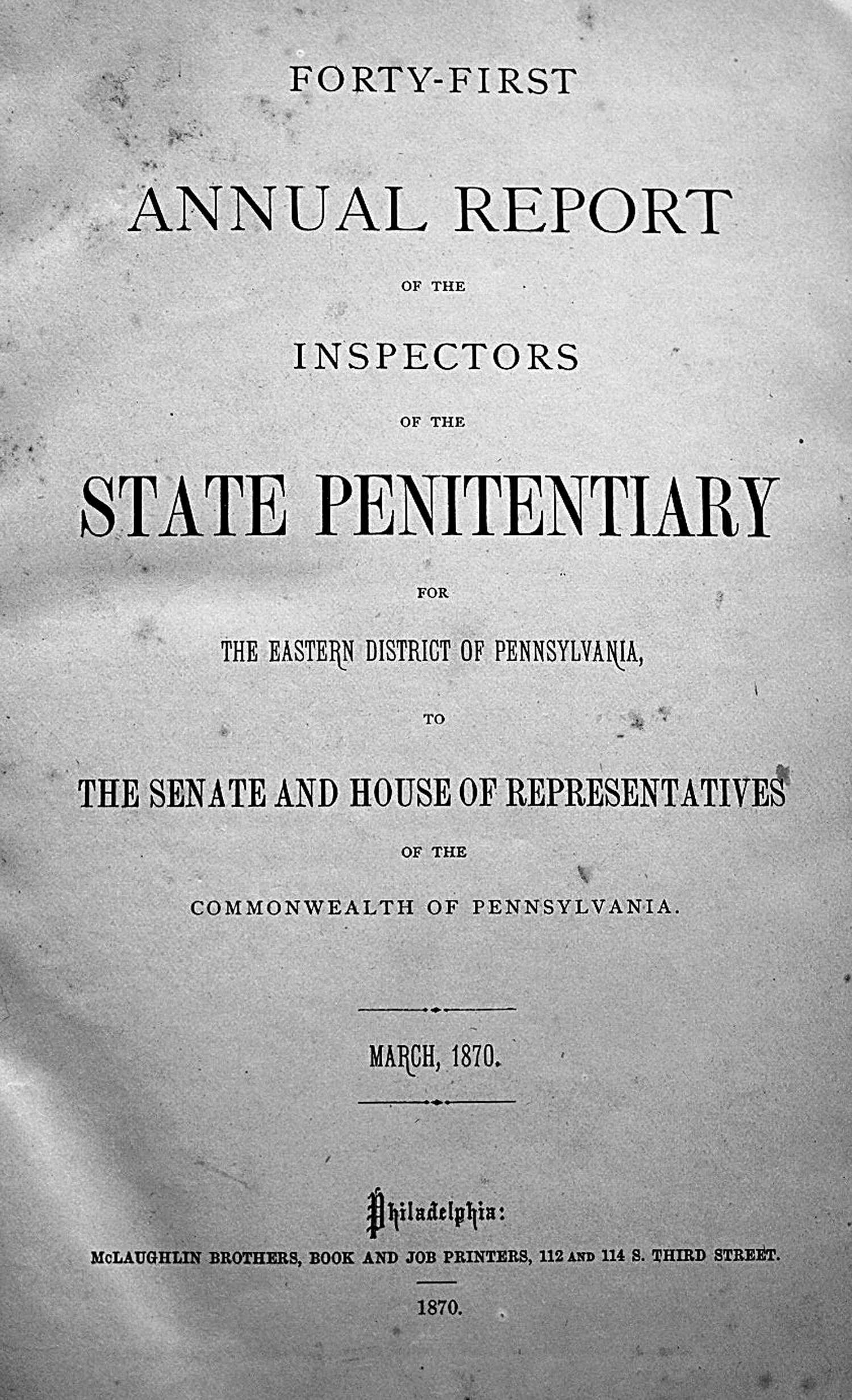 . – Enthält: I. (A. M. M. T.) Béranger. Des moyens propres a généraliser en France le système pénitentiaire. 1 Bl., 135 S. Mit 2 lithographischen Falttafeln. Paris 1836. - ESS, 521. - Erste Einzelausgabe. - II. V. Foucher. Sur la réforme des prisons. XII, 108 S., 1 Bl. Rennes 1838. - III. Documents officiels sur le pénitence de l'est, ou de Cherry-Hill, a Philadelphie, aux Etats-Unis d'Amerique, extraits des rapports anuels depuis 1829 jusqu'a 1843. 1 Bl., 130 S. Mit lithographischer Tafel. Paris 1844. - Sabin 60079. Separatdruck us "Revue pénitentiaire". - IV. J. Adshead. Our present gaol system deeply depraving to the prisoner and a positive evil to the community. 3 Bl., 107 S., 2 Faltblatt. Mit Handschriftenfaksimile in Blau. (London) 1847. - Goldsmiths 32930. und 34329. - V. J. Jebb. Observations on the separate system of discipline submitted to the congress assembled at Brussells, on the subject of prison reform. 64 S. London 1847. - VI. A Lewis. "Crime". An essay. 66 S. London 1871. - Separatdruck aus "Dark blue magazine". - Ferner 3 Jahresberichte aus den Gefängnissen von Pennsylvania, Philadelphia und Maryland 1870. – Teilweise gebräunt und stockfleckig.