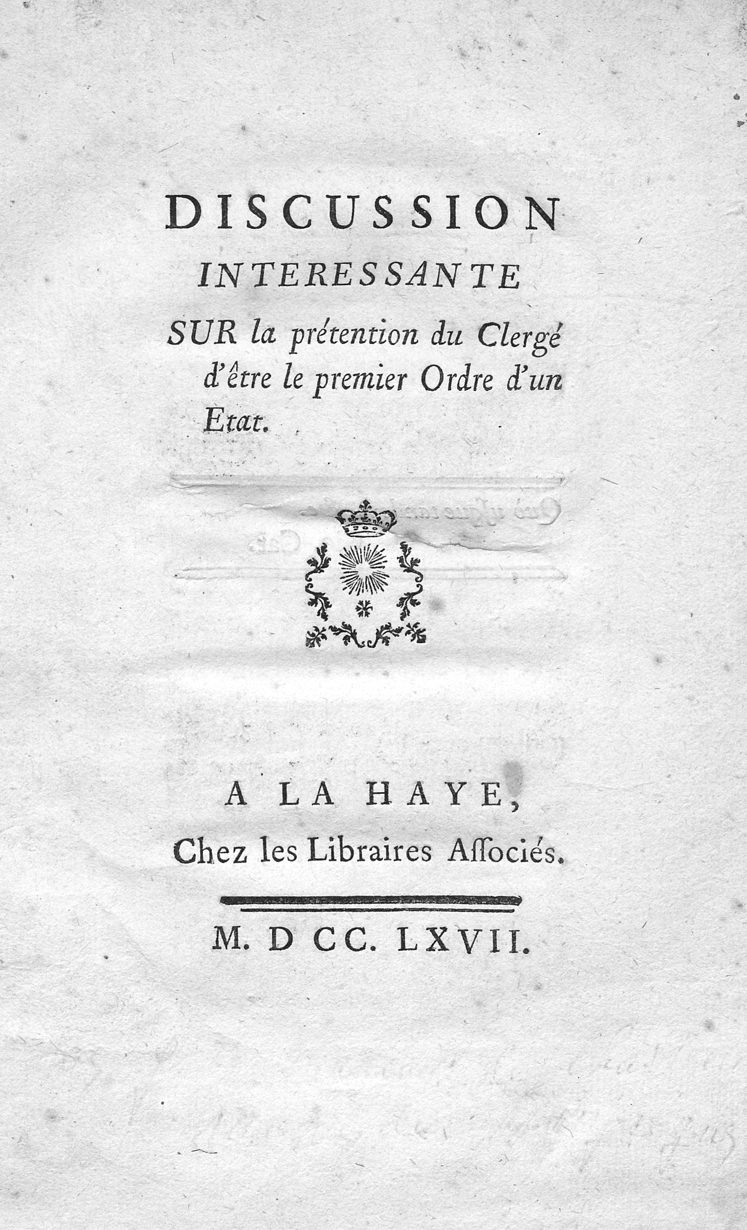 Barbier I, 1052. Cioranescu 51688. INED 3679. Hoefer XLI, 217: "Supprimée par arrêt du conseil d'État." – Erste Ausgabe. Puységur (1716-1782) war General und nahm 1733 an der Belagerung von Kehl teil. Viele seiner Schriften sind anonym erschienen. "Le clergé, obligé au désintéressement et au célibat, n'est pas vraiment propriétaire, mais usufruitier de ses biens. La vrai propriétaire, le Souverain, a le droit d'en disposer. Le clergé ne peut être le premier ordre d'un État, c'est un ordre à part, non directement intéressé comme les autres ordres à la chose publique. Ses membres sont d'ailleurs réputés mineurs par les lois civiles" (INED). – Der Druck war ursprünglich wohl im Oktav-Format geplant, nun aber im Quart-Format hergestellt, sodass alle Ränder sehr breit sind. Papier altersbedingt leicht braunfleckig.