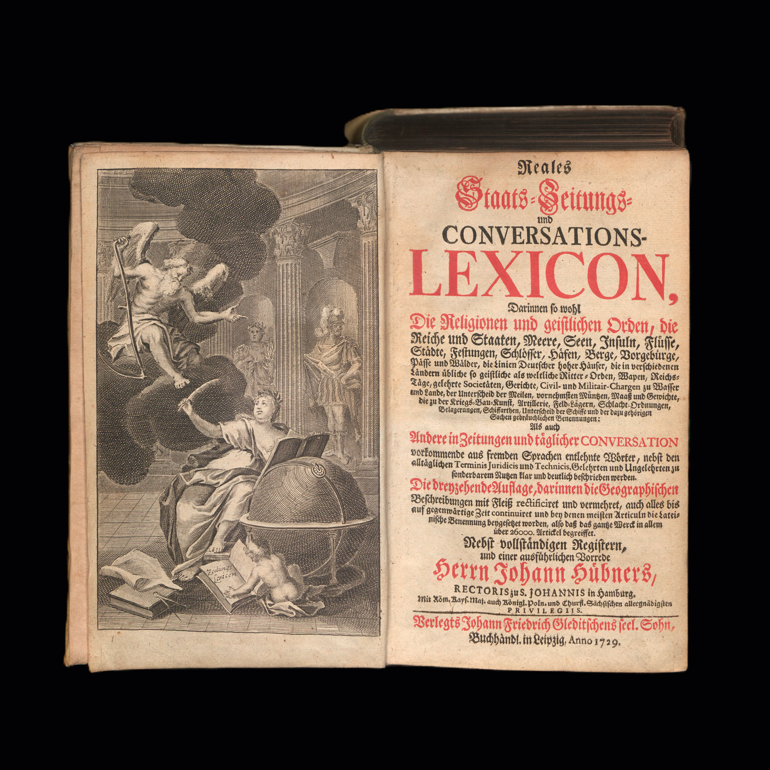 Hübner, Johann. Reales Staats- Zeitungs- Conversations-Lexicon. 13. Auflage. 7 Bl., 2206 Sp., 24 Bl. Titel in Schwarz und Rot. Mit gestochenem Frontispiz. 21,5 x 13 cm. Pergament d. Z. (fleckig und berieben) mit goldgeprägtem RTitel. Leipzig, Johann Friedrich Gleditsch, 1729.