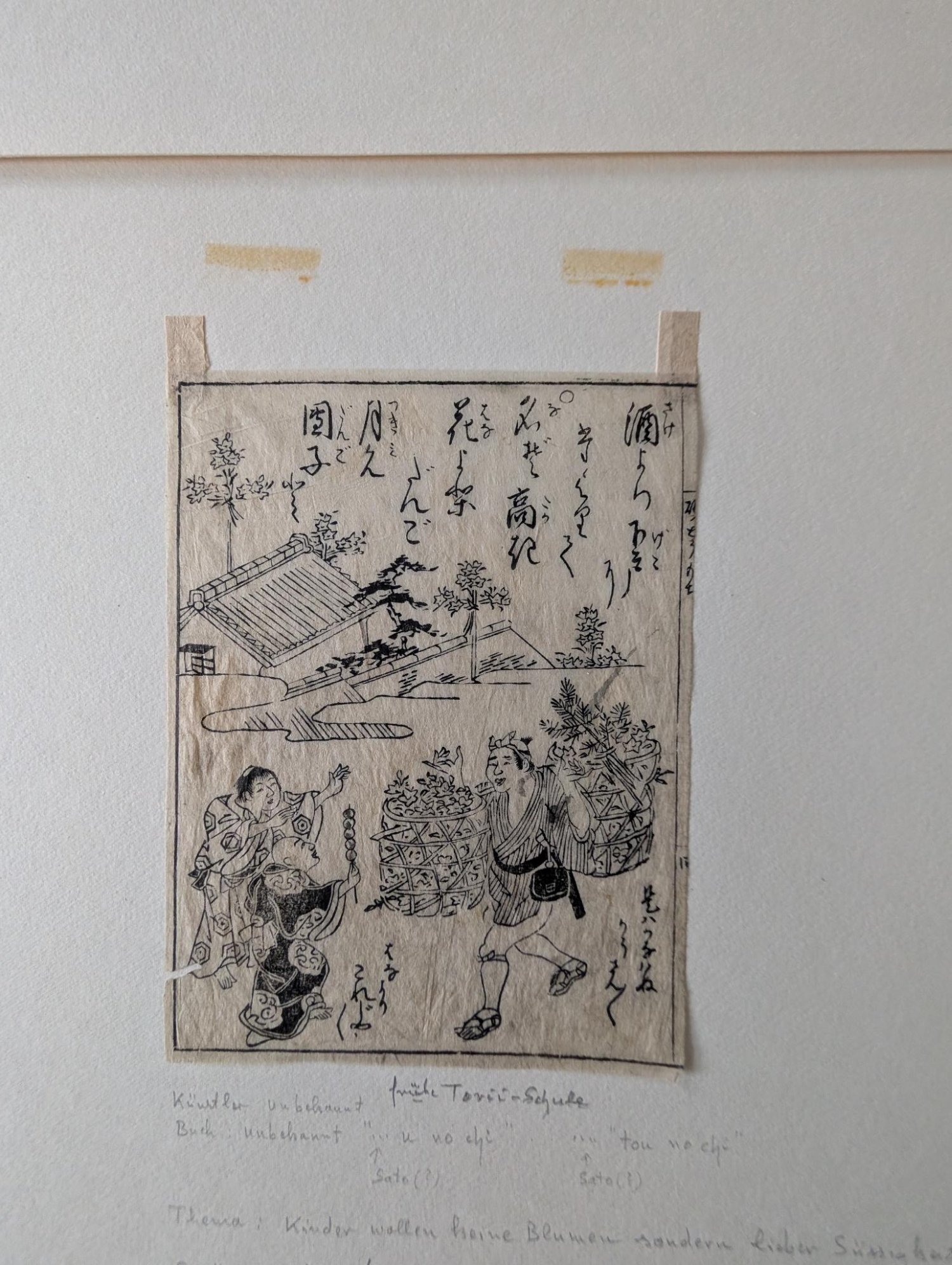 Japanische Buchholzschnitte. Sammlung von 9 Holzschnitt-Albumblättern, davon 3 koloriert, mit unterschiedlichen Darstellungen und von verschiedenen Künstlern, darunter Ando Ichiryusai Hiroshige und Totoya Hokkei. Aus Werken um 1720-1730 (3 Blätter) und um 1830-1850 (6 Blätter). Verschiedene Formate, überwiegend kakuban. Ca. 19 x 15 cm. Sämtlich unter Passepartout. Japan 1720-1850.