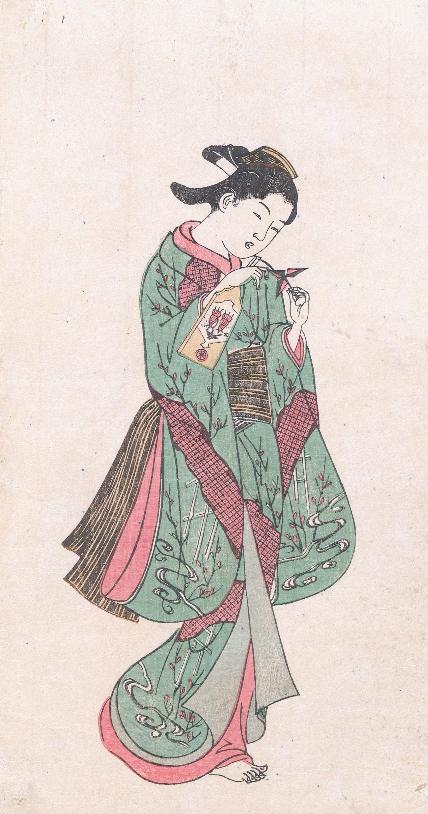 Sieben reizenden Farbholzschnitte des eher selten im Handel auftauchenden Ukiyo-e Künstlers Nishikawa Sukenobu (1671-1750), der vor allem für seine Serien von Bijin, anmutigen Frauen in traditionellen Gewändern bekannt war, die teils in Büchern (Ehon = illustrierte Bücher) veröffentlicht wurden. Hier handelt es sich aber wohl um eigenständige Blätter ohne textlichen Kontext. Der Hügel Asaka (Asakayama) ist eine Erhebung im heutigen öffentlichen Park im Bezirk Kita (Tokio), der bekannt war für seine flanierenden schönen Damen. – Kaum und nur vereinzelt minimal fleckig, geringe Gebrauchsspuren, leicht angestaubt. Sehr hübsche Bildergalerie.