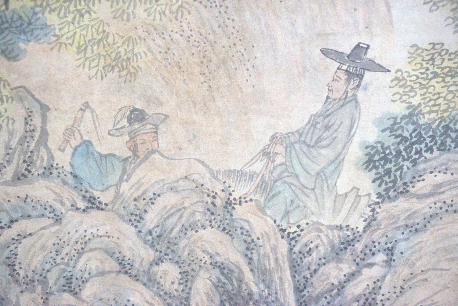 In der chinesischen Tuschmalerei "Shuimo Hua" ist das am höchsten geschätzte Sujet die Landschaft, meist bizarre Bergwelten mit mächtigen Bäumen, mit Wasserfällen, Seen und Flüssen, die enge Schluchten durchschneiden. Figürliche Zusätze bilden meistens nur Staffagen, auch wenn sie oft titelgebend sind. Alles genannten Elemente finden sich hier: Die dargestellte Berglandschaft wirkt auch daher so gewaltig, weil die Staffagen, ein winziges Segelboot, kleine Häuser am Ufer, aber auch die Weiqi-Spieler im Bildmittelgrund eine Relation herstellen. Unten erscheinen zwei Landarbeiter, wohl damit beschäftigt, Reis zu dreschen, während auf einer Bergwiese zwei Spieler das berühmte Weiqi- bzw. Go-Brettspiel spielen, während zwei Zuschauer, einer mit langer Pfeife, ihnen Gesellschaft leisten. – Mehrere, jedoch meist nur kleinere Flecke, hier und da Oberflächenbereibungen, allenthalber kleine Randläsuren, fest auf Kartonpappe montiert, sehr dekorativ und kontemplativ. - Schön gerahmt, nicht ausgerahmt, Versand jedoch nur ohne Rahmen.