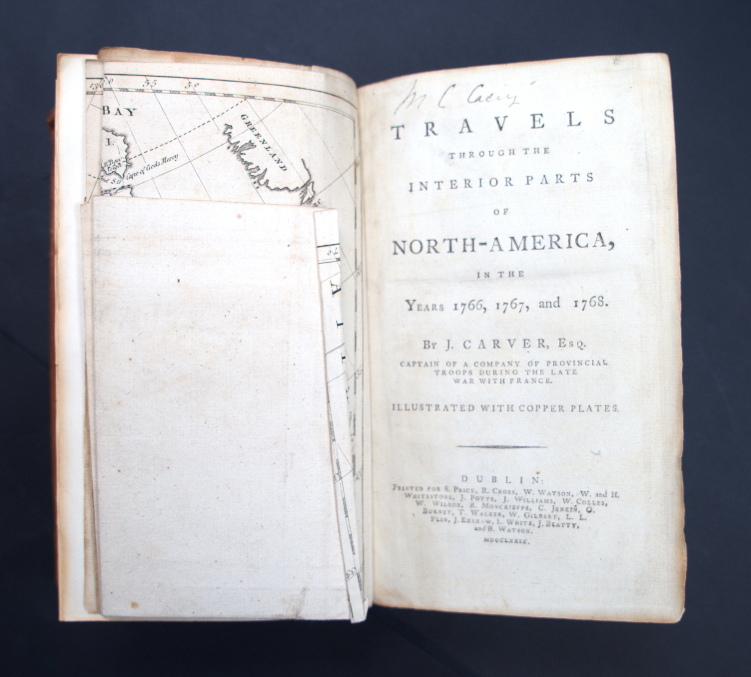 Carver, Jonathan. Travels through the interior parts of North America, in the years 1766, 1767, and 1768. 11 Bl., XIII, 508 S., 1 Bl. Mit 2, teils gefalteten Kupfertafeln und gefaltete Kupferstichkarte. 21 x 12 cm. Leder des 19. Jhr. (etwas berieben, bestoßen und leicht lichtrandig) mit goldgeprägtem RSchild. Dublin, S. Price, R. Cross, W. Watson etc., 1779.